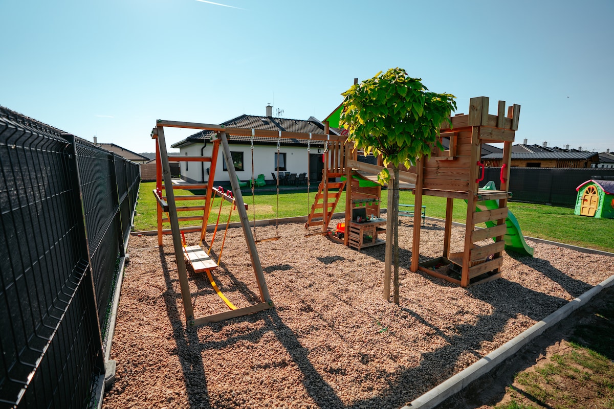 Welcome in spacious and cozy house. Amazing garden with BBQ gril. Terace including sitting bags and children chairs and table. Parking place for 4 cars. Perfect location - Hrádek u Nechanic, aquapark, Fajn park and also amazing bakery shop around. I am happy to help with more trips around. For safety - there are 2 outdoor cameras in front of the house.