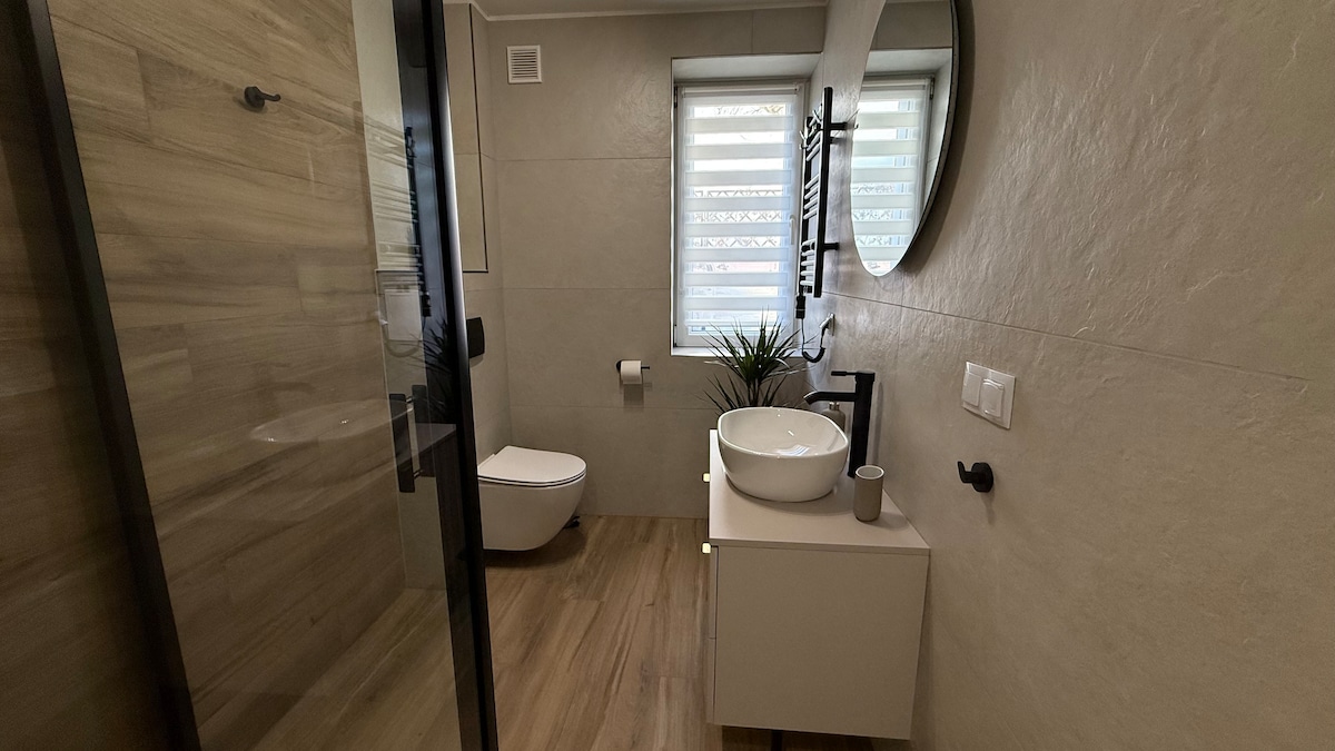 Apartament Mała Poleska – Ten nowoczesny apartament o powierzchni 35 m² zlokalizowany w spokojnym osiedlu oferuje wszystko, czego potrzebujesz do wypoczynku lub pracy. Przyjazny zarówno dla rodzin z dziećmi, jak i podróżujących ze zwierzętami. Wygodne łóżko dwuosobowe, stylowe dodatki, które tworzą przytulną atmosferę. Przestronny i jasny, z wygodną sofą, telewizorem 55″, idealnym na wieczorne seanse filmowe. Prywatna przestrzeń na świeżym powietrzu, idealna na poranną kawę lub relaks wieczorem