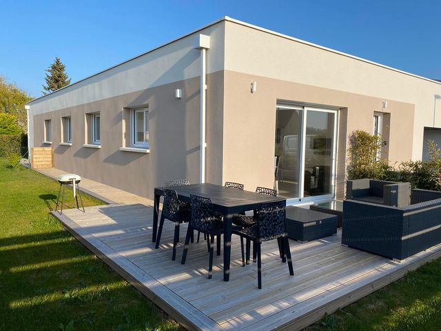 Location d'une maison/appartement de construction neuve avec vue mer. située à 100 m d'une belle plage avec vue sur les Pontons d'Arromanches, cette maison vous offrira le confort de la construction neuve. composée au RdC de deux chambres dont une avec salle de bain WC et meuble vasque, une salle de bain avec wc et meuble vasque, à l'étage un WC, une cuisine entièrement équipée, salle, salon avec canapé convertible, balcon vue mer.