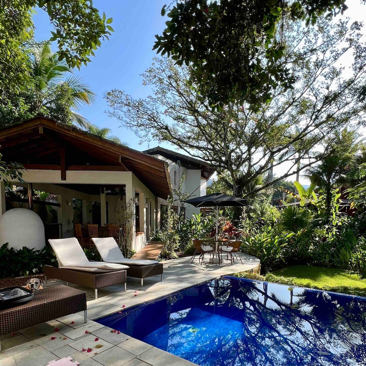 Casa com mobiliário modernista, muito acolhedora e completa. Recém reformada. Tem 3 suítes completas com ar condicionado e banheiro. Sala e varanda com churrasqueira e mesas de almoço e jantar. Com lareira e piscina. O jardim é delicioso com palmeiras e paisagismo lindo. A casa tem atrás uma vista de natureza. Rua pequena bem perto da praia. Tem 1 bicicleta para os hóspedes na casa. Permitido 2 cachorros até porte médio comportados. Tem lençóis, travesseiros e toalhas na casa.