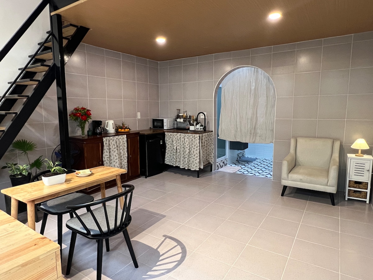 A hidden bungalow with private gate and private spacious patio, perfect for afternoon tea and bbq night, with beautiful sunset view and night lights view Inside the bungalow is and open space, fully furnished with a double bed, a sofa/working station, a reading nook, a kitchen with microwave, electric stoves, fridge… Bathroom with hot bathtub is a perfect plus for this get-away bungalow, so you can enjoy your holiday to the fullest (walking distance to Crazy House, market, stores,restaurants…)