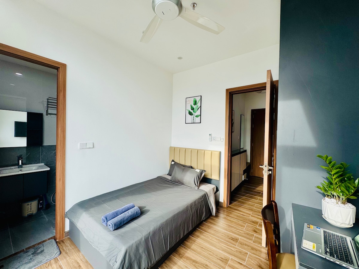 Overlooking the Han River and Da Nang’s iconic bridges, this spacious 110m² apartment offers a peaceful retreat above the city. Located on lively Bạch Đằng Street, opposite the river and just a short walk from Han Market, guests can enjoy Dragon Bridge’s fire show at 9PM on weekends from their own balcony. Designed in deep navy tones with warm wood finishes, the home feels calm, refined. Daily housekeeping, free pool, gym, table tennis make it ideal for families, business travelers, long stays.