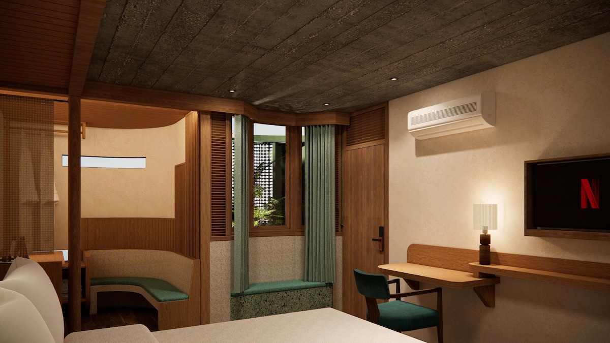 This cozy room at The Memory Danang features warm wooden interiors combined with a minimalist concrete ceiling, creating a calm and private atmosphere, perfect for couple. A highlight of the room is the terrazzo bathtub, thoughtfully designed for a relaxing bathing experience.