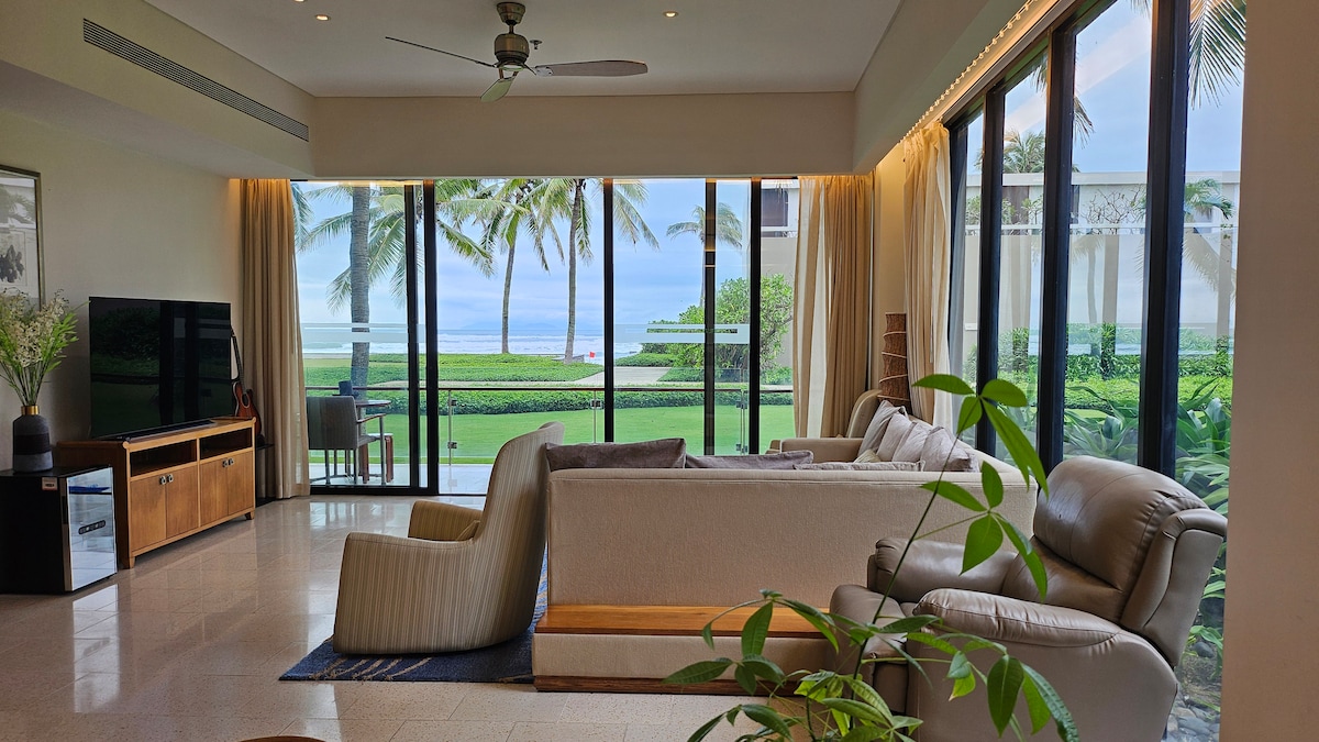 Welcome to our unique oceanfront corner suite right across My Khe beach. It is meticulously designed with a coastal theme and equipped with high-end furnishing. With 80 square meters of elegantly designed living space, our beach home promises a truly unforgettable stay. Important Notice: Our property is situated right at the central beach, directly across from where holiday events take place. Additionally, there's a bar nearby that plays music at night.