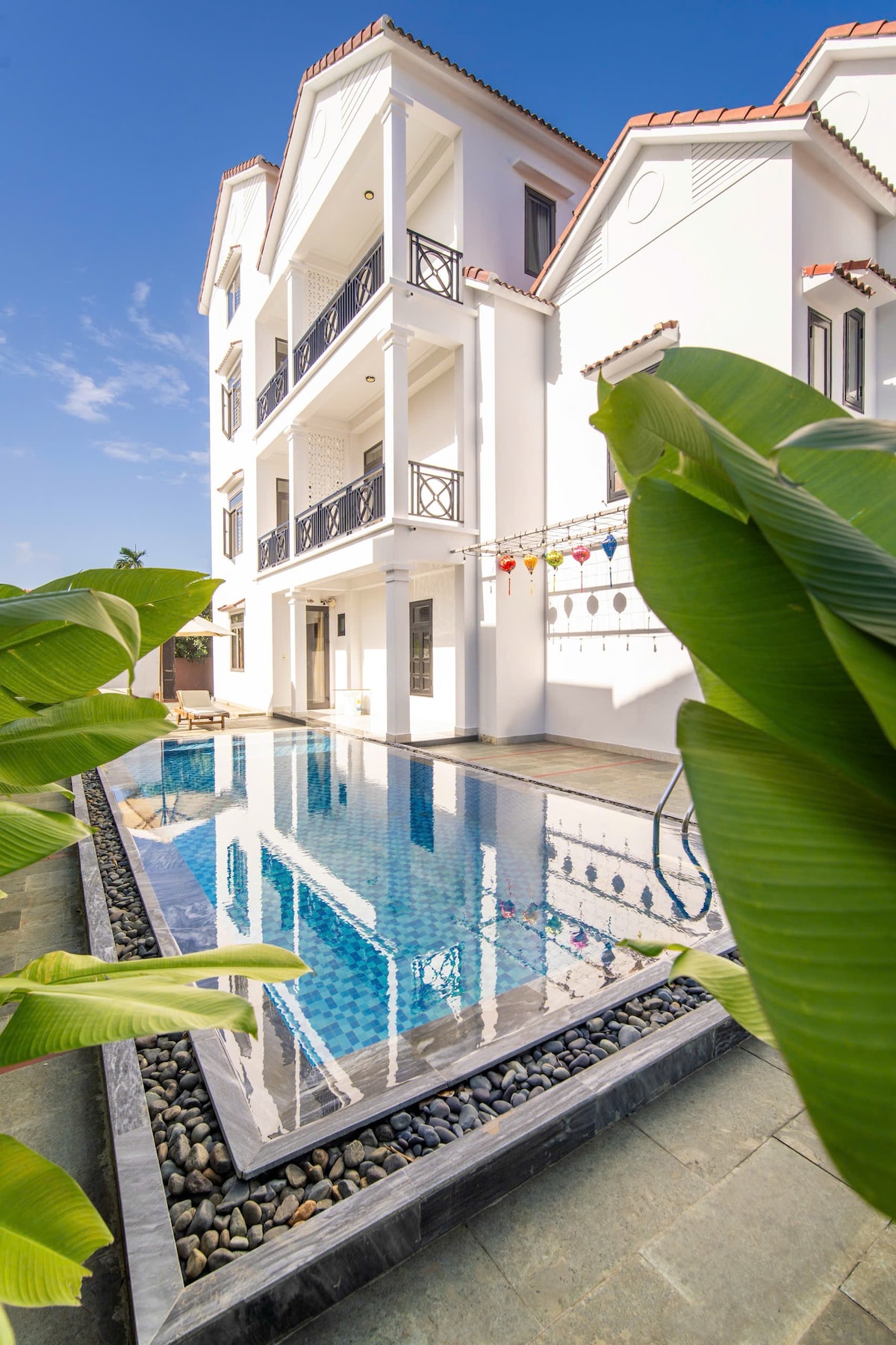 # Room 203 – 2nd Floor Balcony with Pool & Coconut Forest Views # Private balcony room overlooking the villa’s pool and coconut palm forest, located beside a stream in Cẩm Thanh. Includes: - Free daily breakfast - Complimentary 4-seat car transfer from Da Nang Airport/Train Station (stays of 15+ nights) - 3 km to Hội An Ancient Town | 5 km to An Bang Beach | 2km to Bay Mau Coconut Forest | Bà Lê Marketplace 1km