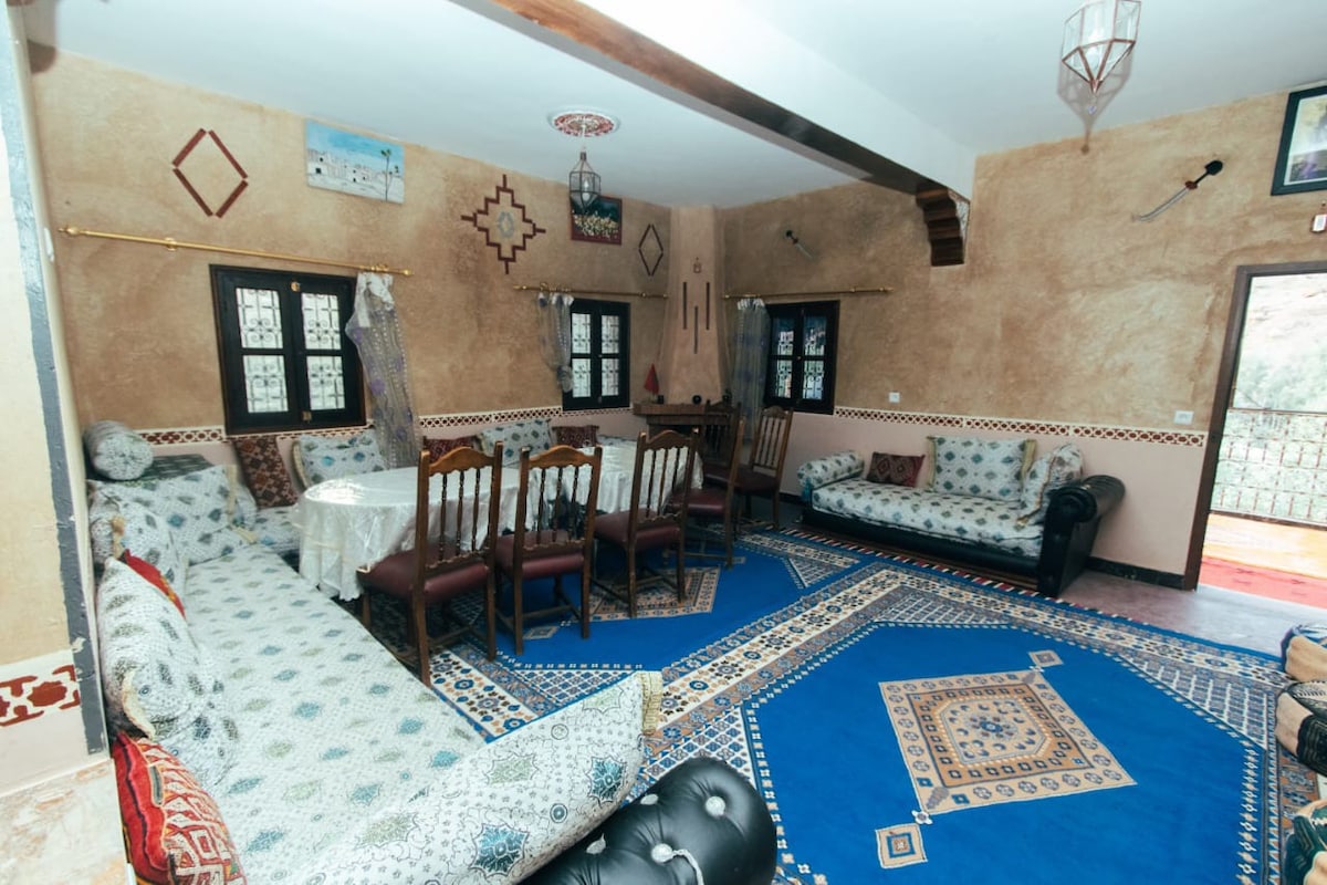 Enjoy the elegance of a bygone era by staying in our kasbah built on clay. Nicely decorated and with a unique panoramic view. The house is located in the dades valley halfway from Marrakech and the dunes of the Merzouga desert is Chgaga rooms with private shower and toilet, the shared spaces are 2 living rooms, dining rooms, two terraces with 360 ° view on the valley of the dades. Free parking, free 100Mbps fiber optic internet connection, restaurant on site