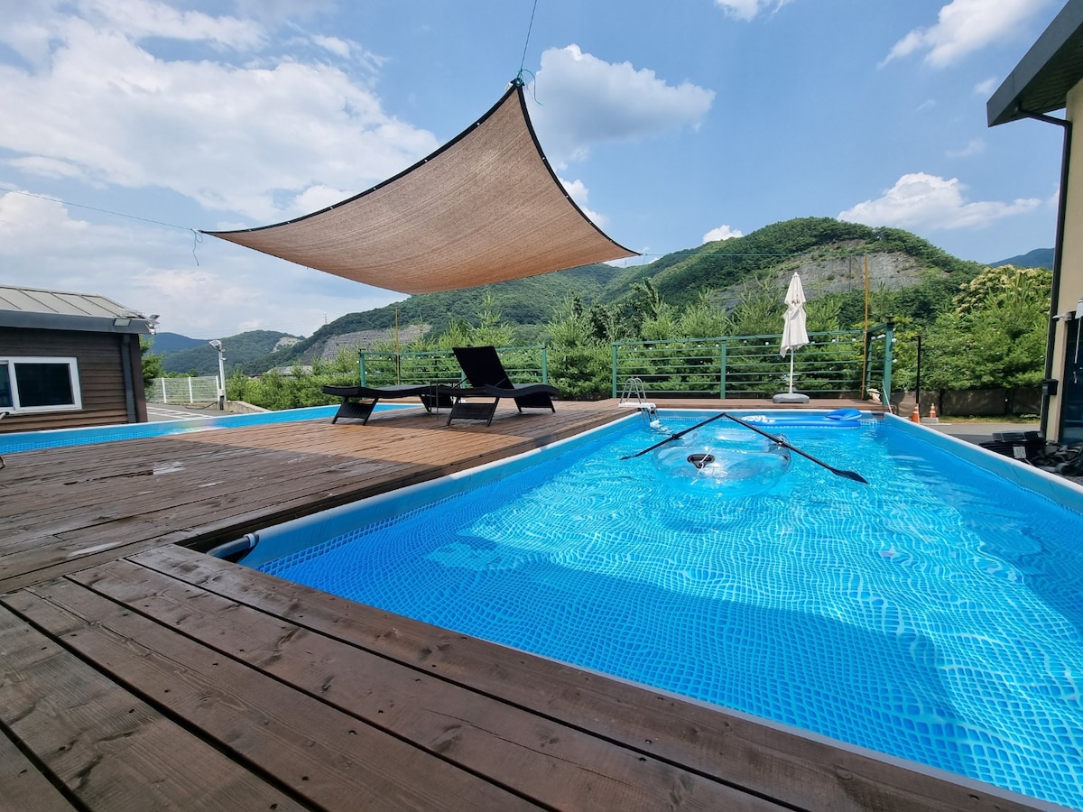 🌈시설 이용료 없어요💗 🎈요금안내🎈 일~금, 공휴일당일 - 2인 기준 토, 공휴일전일 - 6인 기준 성인 최대 6인, 영유아 포함 최대 8인 가능. 36개월 미만 추가비 무료 - 유아로 선택. 🍖야외 바베큐장 - 돌판, 숯그릴 돌판구이는 장작을, 숯불구이는 숯을 준비해주셔야 합니다.(+부탄가스) (석쇠, 장갑, 집게, 토치 제공.) 👉2인 예약 시 문의 바랍니다. 한적한 시골에 산이 품고 있는 숙소에요. 저희 부모님께서 손주들이 맘놓고 놀았으면 하고 만드신 집입니다. 소중한 분들과 오셔서 함께 귀중한 시간을 보내고 그 속에서 자연이 주는 마음의 평화도 함께 느껴보시길 바랍니다.