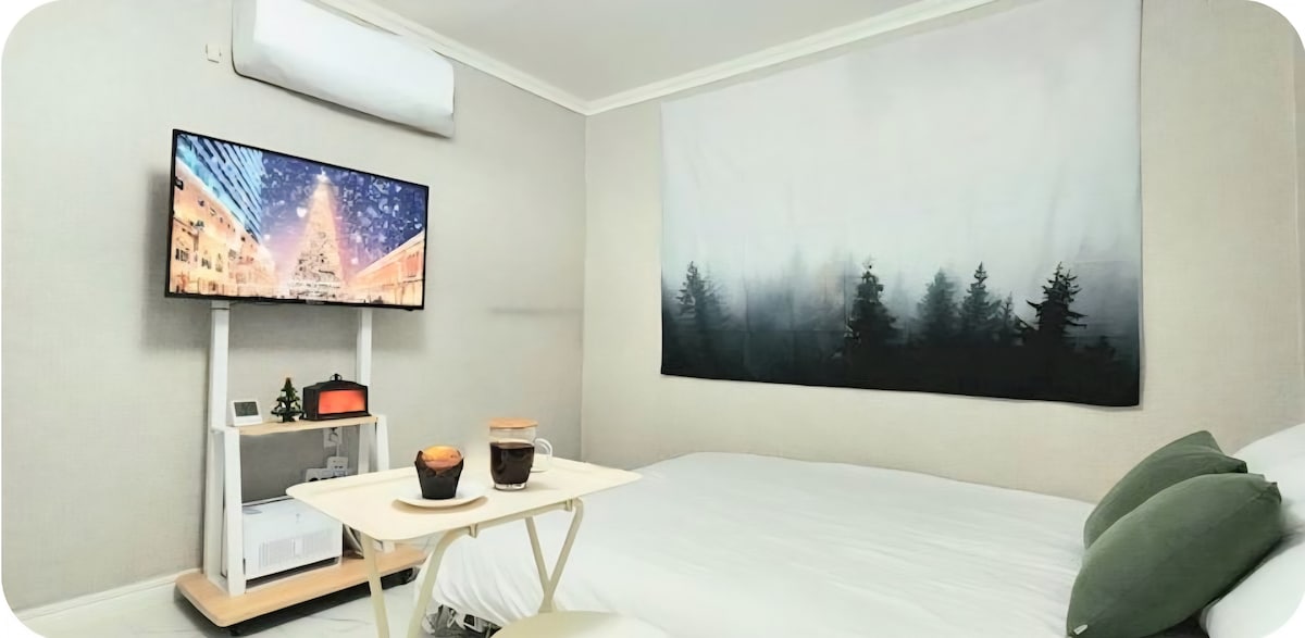 방 1개, 거실, 욕실 1개로 구성된 깔끔하고 아늑한 공간이며, 숙소 전체를 단독으로 이용하실 수 있습니다. • 옷걸이, 에어컨, 세탁기 등 기본 생활에 필요한 편의시설이 잘 갖춰져 있습니다. • 주방 공간도 마련되어 있어 간단한 요리도 가능합니다. • 여름에는 시원한 냉방, 겨울에는 따뜻한 보일러 난방이 잘 되어 있어 계절에 상관없이 쾌적한 숙박이 가능합니다. • TV와 와이파이도 설치되어 있어 여가 시간도 편리하게 보내실 수 있습니다.