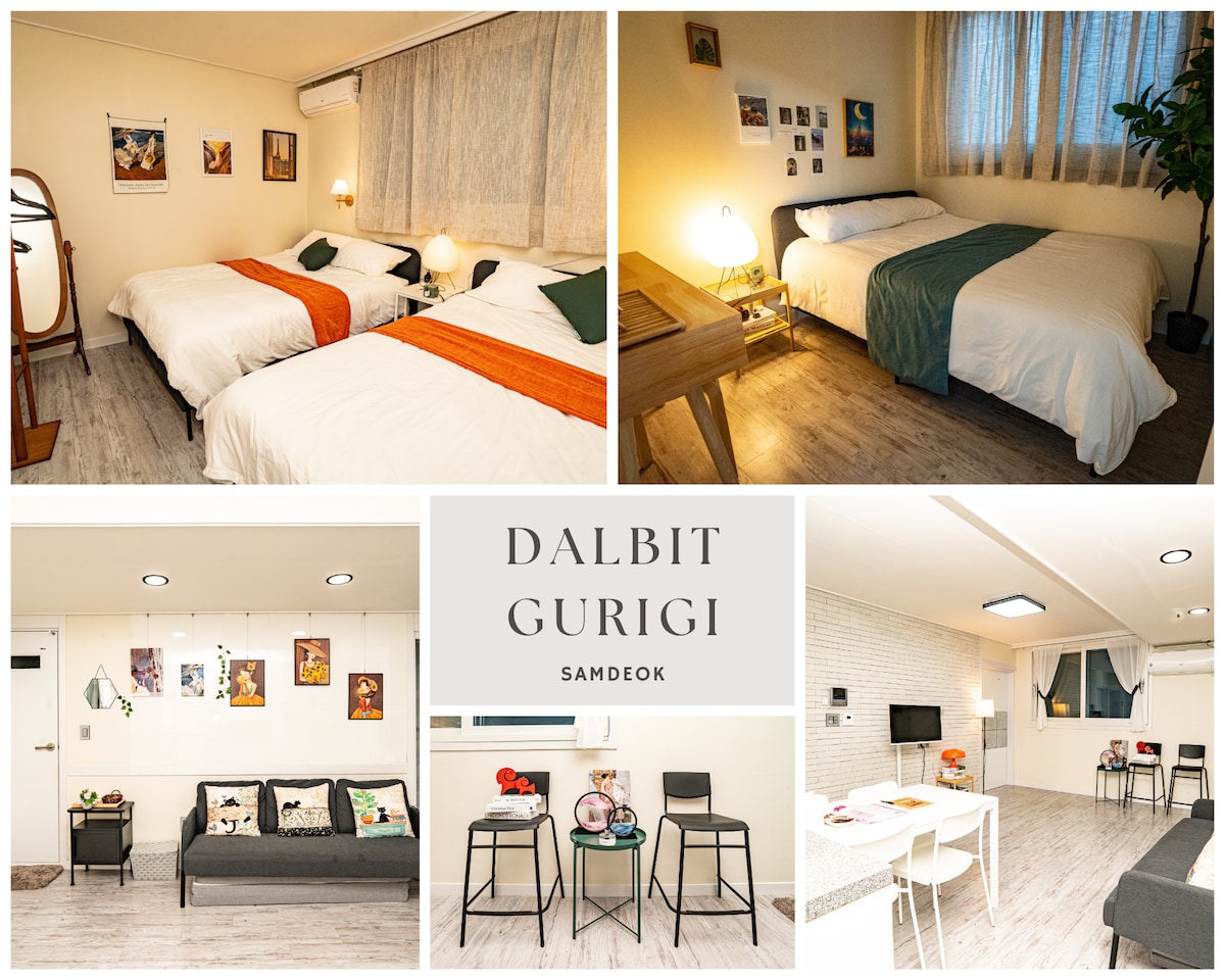 🐶 소형 반려견 동반 가능 숙소입니다 . ❣️ 따뜻한 햇살이 머무는 아늑한 2룸 감성숙소입니다. 많은 게스트분들께서 편안하고 아늑하다고 남겨주신 공간입니다.💫 🌿 여유로운 쉼, 아늑감성숙소 동대구역에서 도보 10분 거리, 빈티지한 무드와 식물 인테리어가 어우러진 21평 아늑한 숙소입니다. 🏡 숙소는 3층에 위치/ 엘리베이터는 없어요. *작은 운동 후 만나는 따뜻한 쉼, 여유롭게 올라와주세요 :) 늦잠 자도 괜찮아요. 체크아웃은 오후 1시^^ 반려동물도 동반 가능하며, 1층에는 GS25 편의점이 있어 편리성 좋아요. ✨ 숙소 정보 요약 동대구역 도보 10분 /버스 정류장 도보 3분 3층 도보 이동 (엘리베이터 없음) 체크아웃 오후 1시 /캐리어 보관 가능 반려견 1마리 동반 가능 (소형견 기준) 2룸, 넓은 거실 21평 /퀸사이즈 침대 3 넓은 6인용 테이블 /1층 GS25 편의점 감성 식물 인테리어 /빈티지 무드조명