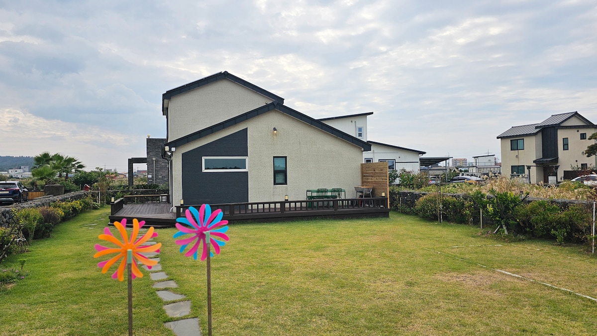 Enjoy an outdoor BBQ, a steamy jacuzzi in a beautiful private yard, a cozy bonfire, and star-gazing at night. You can see Mt. Halla on your left and a gorgeous sunset on your right! Conveniently located on Olle 9 trail. 3-minute walk to Gun-san trailhead. 2-minute drive to a major street. Our home is called "San Area Stay" or "์ฐ์๋" in Korean. Custom-built with environment-friendly materials. We are fluent in English, so please feel free to reach out to us with any questions!