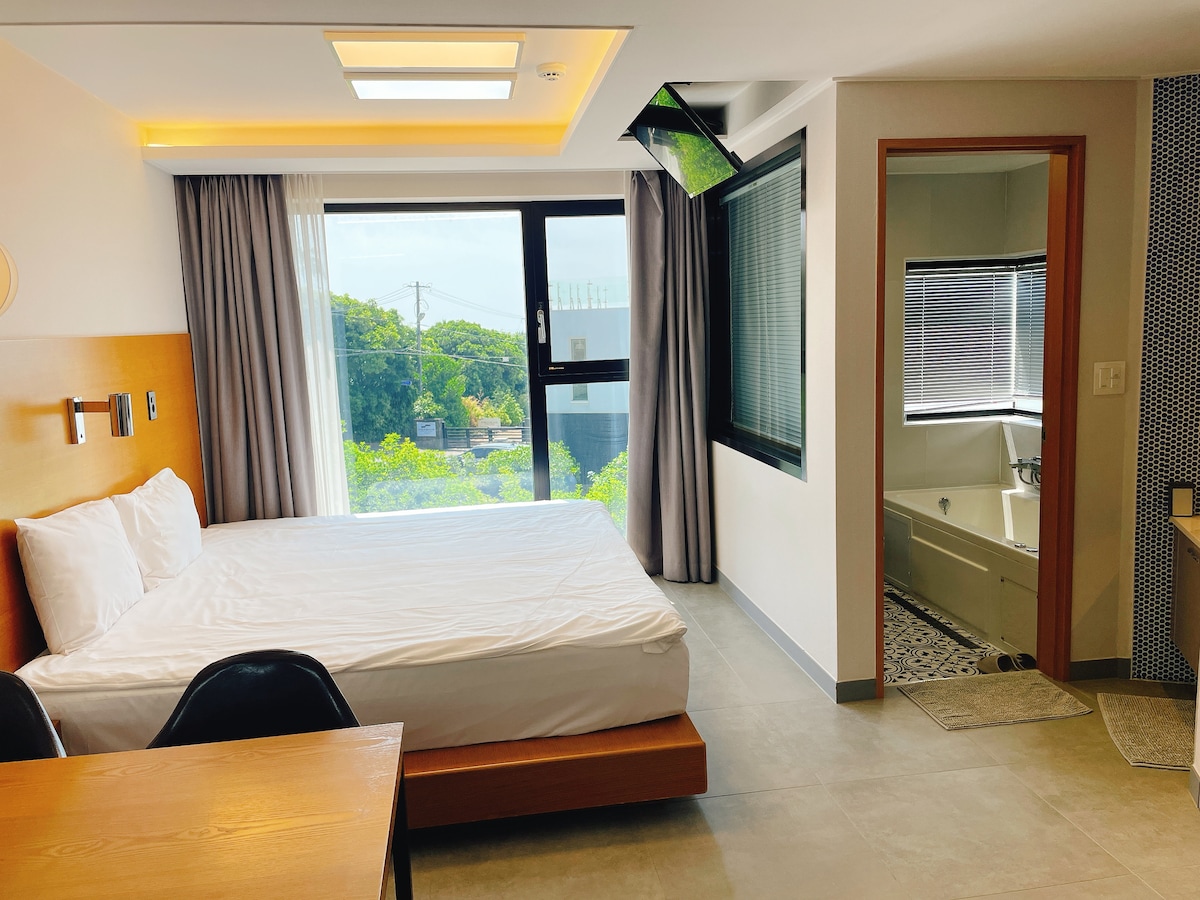豪华客房# 2/距离济州机场5分钟!蓝色海洋景观/步行5分钟到达欧利芙英/东门市场、Chilseong-ro