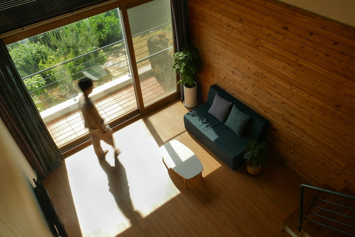 this is a two-story detached house. we are living in ground floor with preparing to help you. and you can stay in second floor and front door is other thing. the second floor is duplex type and there are two rooftop terrace, a large salon attic. one terrace is sea view and another one is Hallasan Mountain view. living room is like a greenhouse cafe with huge glass window. ground is kitchen garden. I love to glow various kind of plants. if you cook something, you can picking this vegetables.