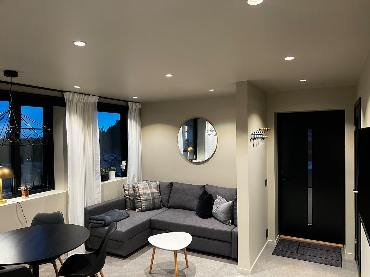 Kök och allrum med 155 cm dagsäng och havsutsikt. Stort sovrum med 160 cm dubbelsäng. Kök med ugn/induksjonshäll, kyl/frys, disk och micro. Bad med dusch, tvättmaskin och torktumlare. Altan och stor uteplats med gräs. Parkering utanför. 10 minuters gånge til vattnet med stränder, klippor och båthamn, skogen 1 minut bakom huset. 15 min att köra til centrum, 10 minuter til Nordby shopping. 20 minuter till Koster med båt. Lugnt område.