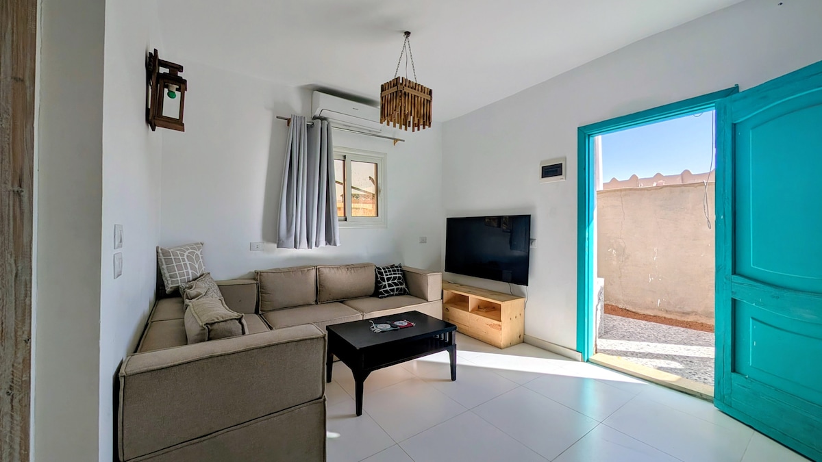 This cozy apartment is located in Eel Garden area 1mins walk to the beach A beautiful bedroom with air conditioning & big window looking over the garden and the palms living room space with sofa & Fully equipped kitchen colorful and modern bathroom huge comfy shared garden full of palms and tree, sea view roof top to enjoy and relax during the day or in the evening to watch the stars, close to everything you will need in dahab yet its very quiet area offering all my guest relaxing holiday.