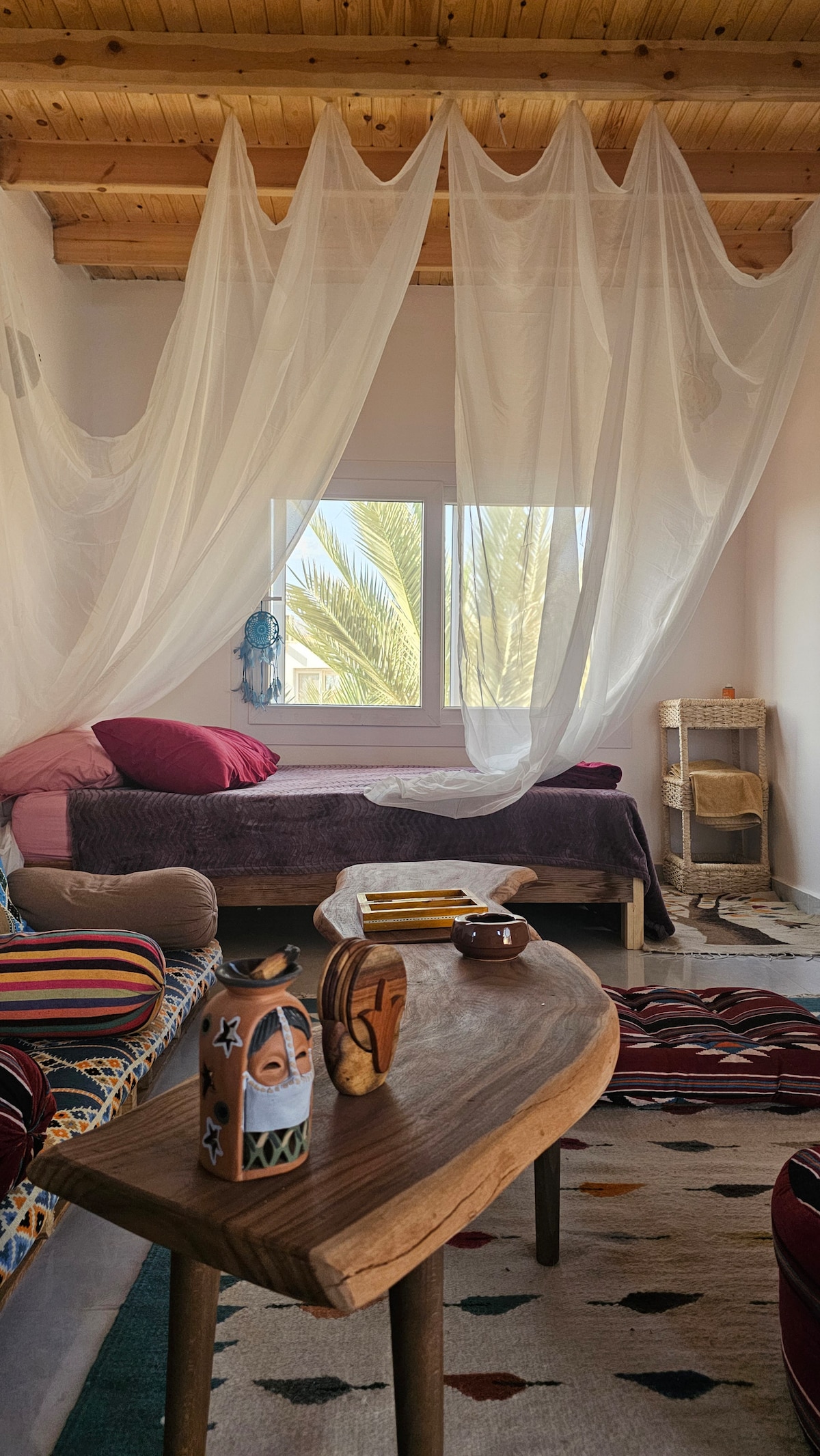 Tucked away in a quiet local neighborhood, this hidden Dahab gem offers comfort and privacy with a true sense of retreat, while still being only an 8-minute walk from the lively Lighthouse area and the beach. Wake to the sound of roosters and enjoy your morning coffee in the garden. At sunset, head up to the rooftop for sweeping views of Sinai’s changing colors, then end the evening around the peaceful garden fire under a sky full of stars, with the city glowing in the distance.