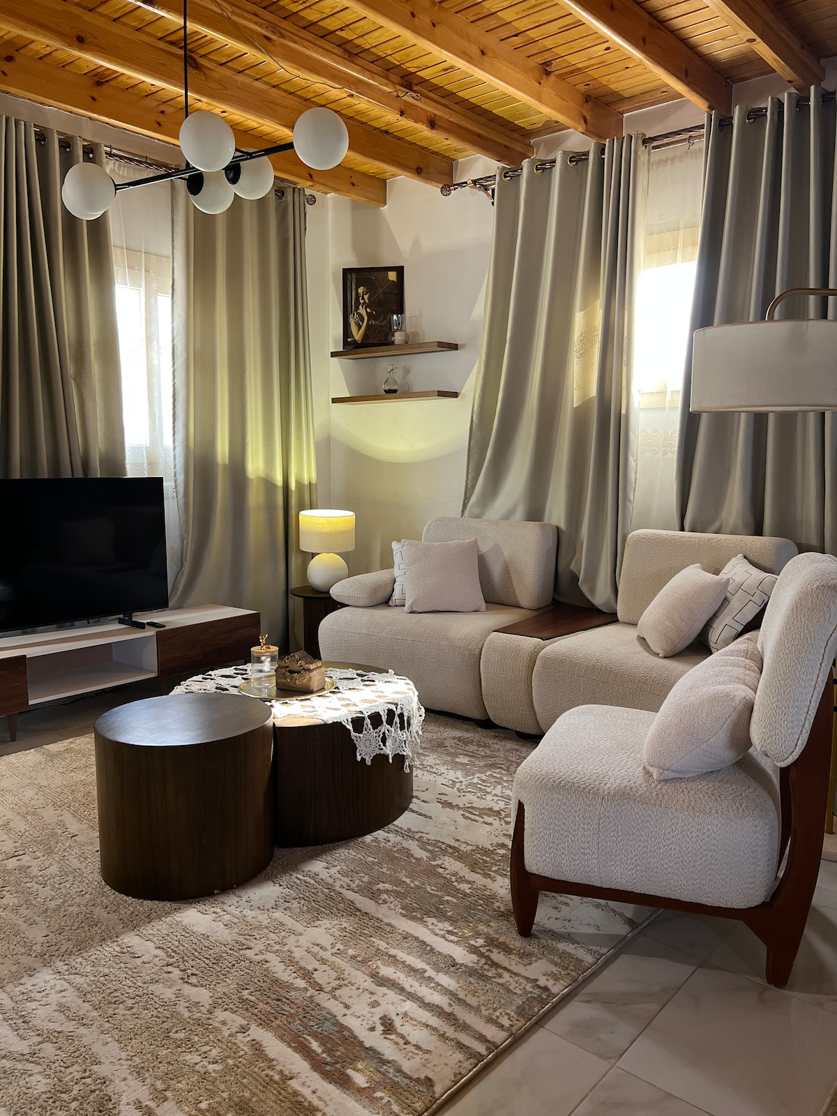 Welcome to your cozy home away from home in Dahab! Located on the first floor, the ‘Sea’-through apartment offers beautiful views of the sea through palm branches and sun rays, just as the picture shows. This spacious 1-bedroom apartment is filled with handmade furniture and accessories that reflect the organic and natural lifestyle we love in Dahab. Situated on the second line directly by the beach, it’s just a 3-minute walk to Assala market and a 10-minute walk to the Lighthouse.