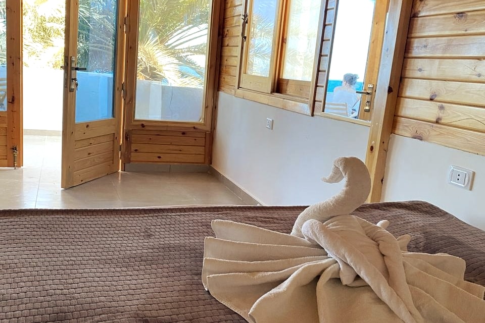 Step into your peaceful beachfront chalet and head up to the huge, sunny private rooftop terrace where sweeping panoramic views of the Red Sea greet you. Located right on the seafront, this space offers direct access to the beach and a vibrant coral reef just a few steps away — perfect for swimming, snorkeling, or simply enjoying the ocean. Whether you want to relax in the sun, explore the underwater world, or enjoy local dining nearby, everything you need is within easy reach.