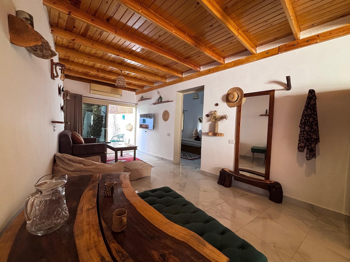 Welcome to your cozy home away from home in Dahab! Located on the first floor, the ‘Sea’-through apartment offers beautiful views of the sea through palm branches and sun rays, just as the picture shows. This spacious 1-bedroom apartment is filled with handmade furniture and accessories that reflect the organic and natural lifestyle we love in Dahab. Situated on the second line directly by the beach, it’s just a 3-minute walk to Assala market and a 10-minute walk to the Lighthouse.