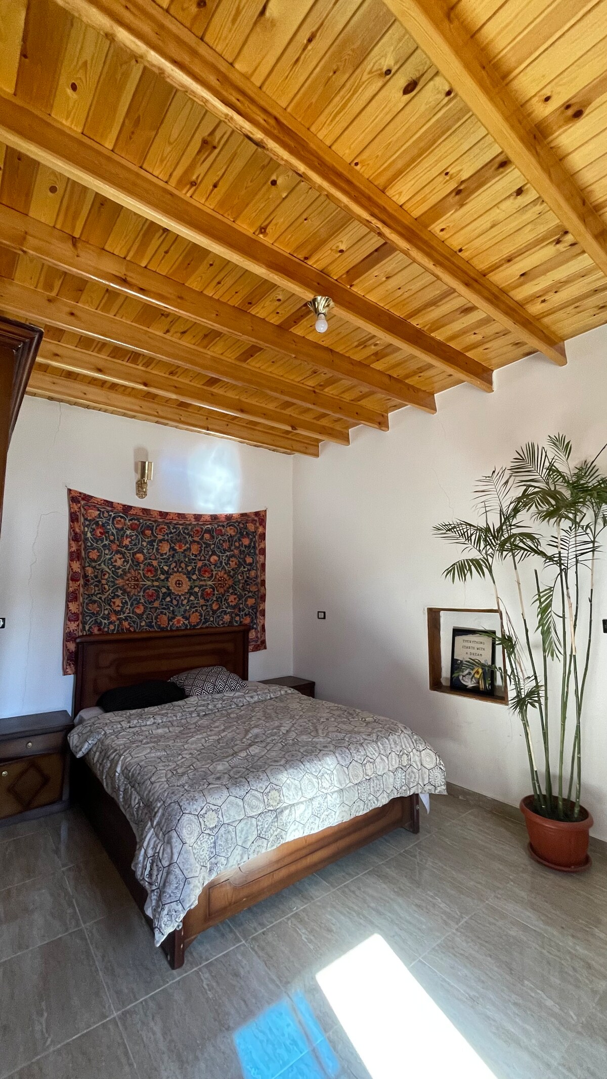 A clean and functional space designed for a comfortable stay in Dahab. The apartment includes a sleeping area, dining/work space, a lounge corner and a practical kitchen with essentials, and a fully tiled bathroom with walk-in shower and washing machine. Enjoy access to a private rooftop terrace with open views of the palm trees and mountains. Ideal for guests looking for a simple, relaxed, and easy stay nearby the beach.