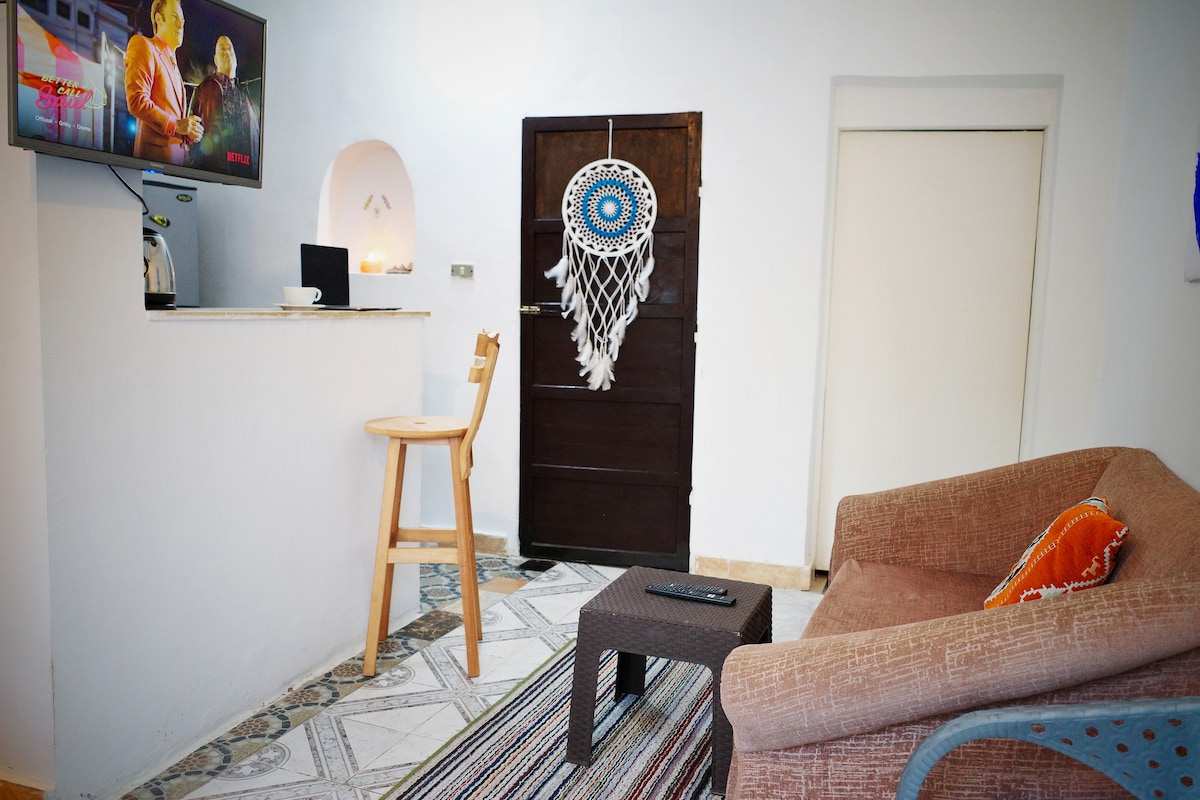 Chill out at our private peaceful studio in the heart of Assalah, and in an authentic beduin neighborhood ( Behind Solaris Dahab and Beit Theresea ) less than 2 min to the sea and 1 min to Assalah markets . And you can enjoy the sea breeze while relaxing in the cozy north-facing outside seating area . We have a strong wifi ( our own router is in the place , not a shared one ) in case u want to get some work done .