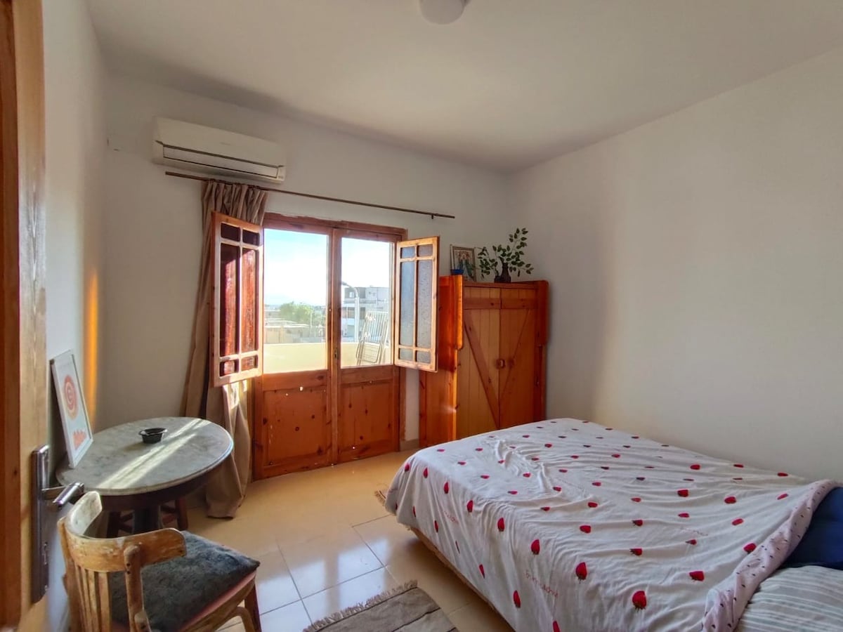 Newly rennovated one bedroom apartment with twin beds located at the heart of Dahab✨ 🎉 Discounted daily rates ⚡️10% discount on weekly stays ⚡️⚡️ 60% discount on monthly stays 🌞 Located at the Fanar st./LH 🌊 5mins walk to the beach ❄️ AC and Fan 🛜 Wifi 👩🍳 Equipped kitchen 🫧 Washing machine full automatic 🔑 Self checkin (lock box) 🤿 Great stay for scuba&freedivers 🌄 Mountains view; mesmerizing sunset 🍔 Restaurants/cafes/shops nearby 🛒 Market, Pharmacy nearby 🏋️♀️ Gym nearby