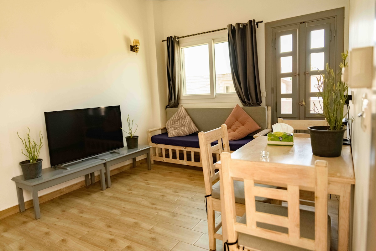 Elite Residence is one of the top places in Dahab. The place will provide you with an amazing experience in as it is sunny, clean, comfortable, and very close to the place of interests in Dahab. It is located 5 minutes away from the light house, 5 minutes from the Asslah market and 200M away from grocery store. You have access to your private roof terrace, as well as the communal area next door. Landline internet is very stable. Guests here are friendly too.