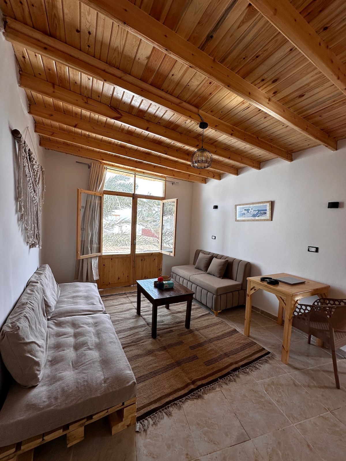 A bohemian-style chalet in Dahab, with sea view in Eel garden and just steps away from Coral Coast. It features two cozy bedrooms, an open and stylish reception area, and a lovely rooftop with stunning sea views. The interior is designed with a warm, bohemian vibe, reflecting a calm and relaxing atmosphere, with natural decor and earthy tones. It’s the perfect place to unwind and enjoy the beauty of the sea and nature