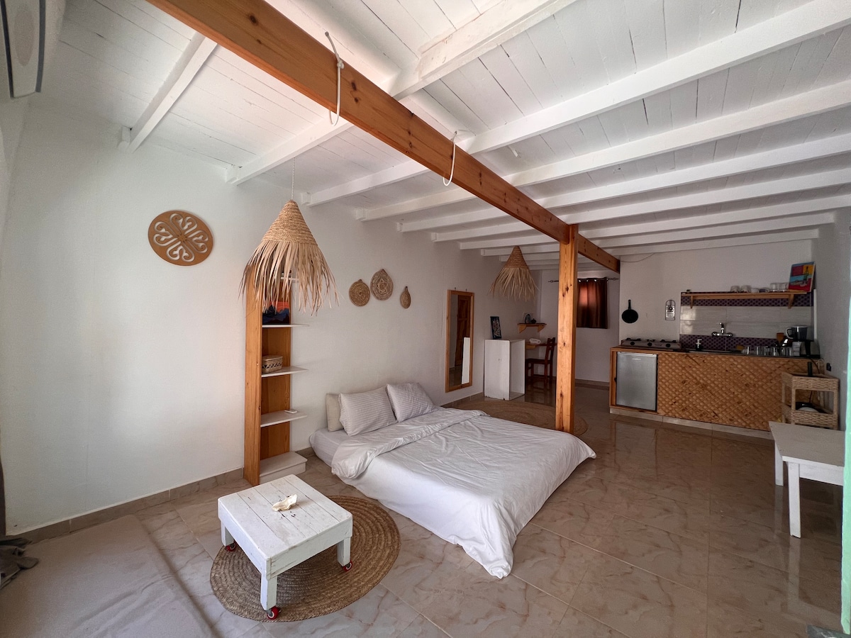 Experience Dahab in this Moroccan-inspired apartment with terrace. Just a 1-minute walk from the beach & promenade. Includes a king-size bed, fully equipped kitchen, vinyl player, washing machine, dresser, and private bathroom. Ideal for first-time visitors, divers, kite-surfers, or remote workers. Walk to cafes, kitesurfing spots, dive centers, & live music spots. We are Superhosts that provide you with all the essentials & keep your comfort in mind. We don't compromise & neither should you.