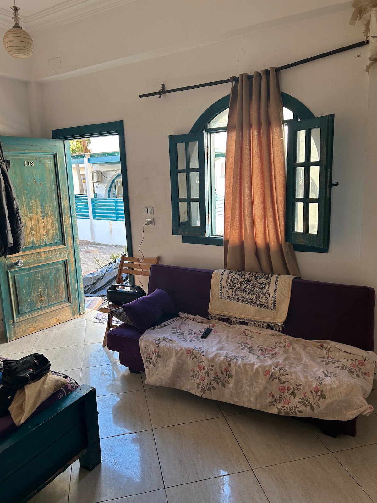 Centrally located by the Assala beach and near all the cool spots, this apartment is 2 minutes from a supermarket, ATM, pharmacy, cafés, and restaurants. It offers high-speed internet, a king-sized bed, air conditioning, 2 couches, a table, chairs, a kitchen, a bathroom, and an outdoor area. There are 3 security cameras outside. Mixed couples with at least one Egyptian must provide a marriage certificate; this doesn’t apply to foreigners only.