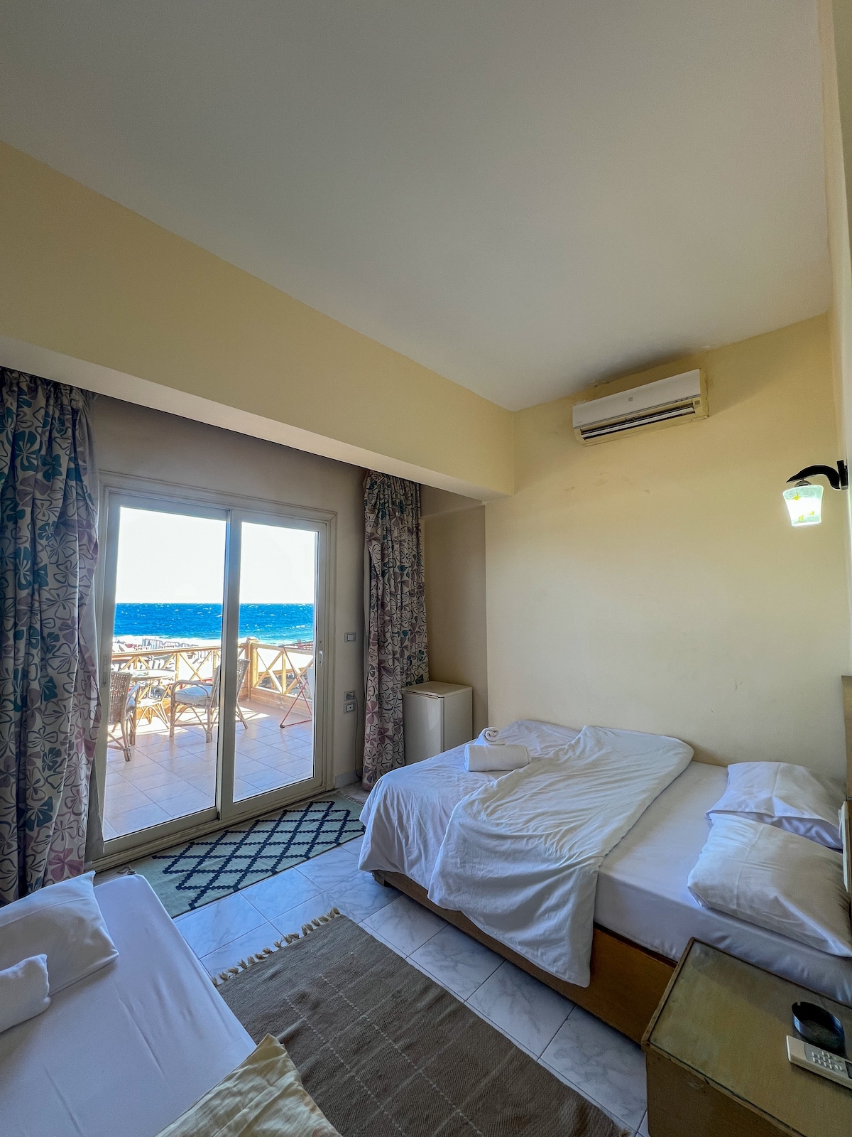 Room 60 – Sea & Mountain View Wake up to the stunning blue sea right at your doorstep. This bright room features a private balcony overlooking the water and the mountains, A/C, comfortable beds, mini-fridge, and a clean bathroom with shower. Perfect for relaxing, enjoying sunrise views, and staying steps away from the beach.