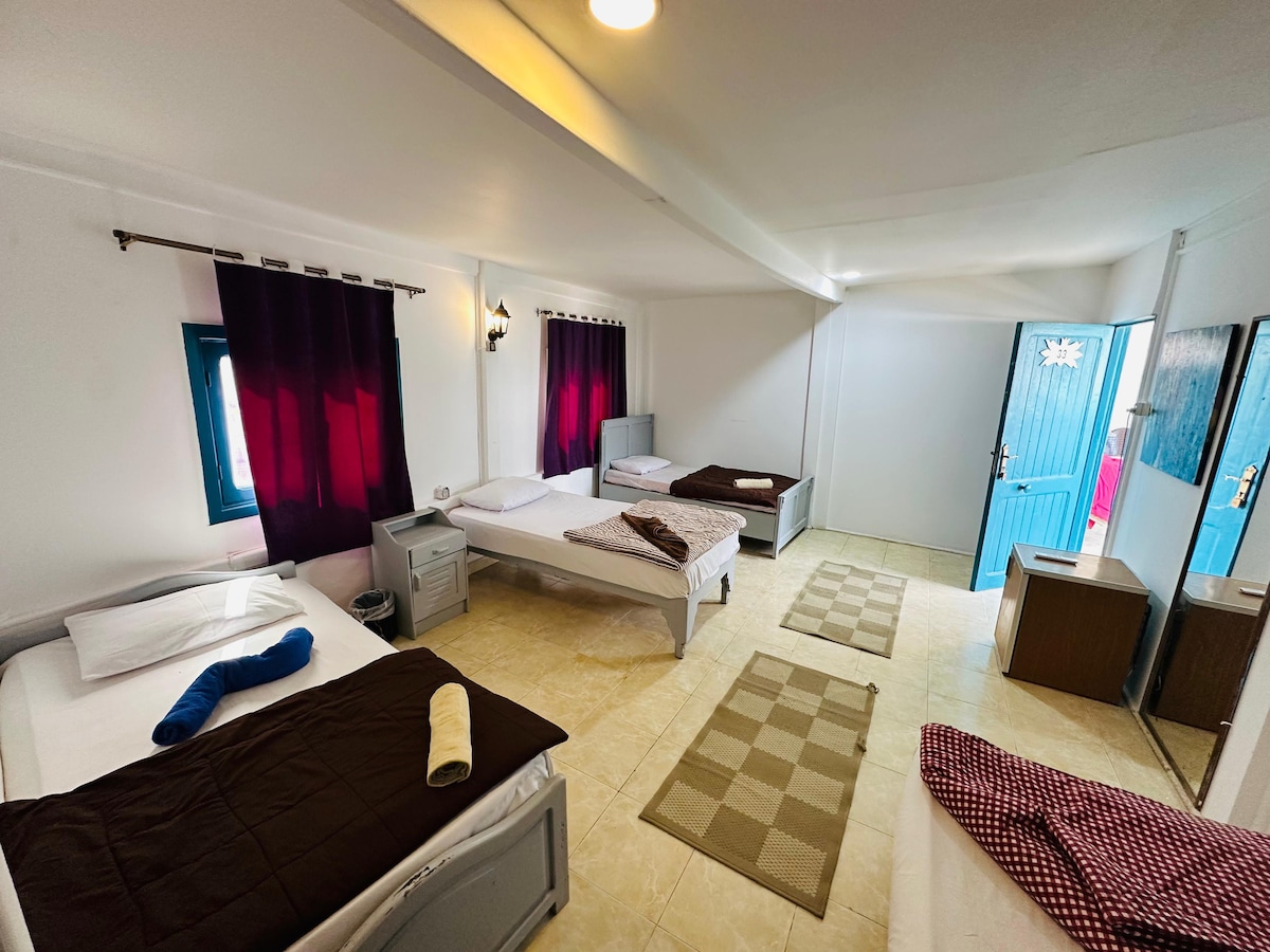Stay right by the beach in this comfy, fully air-conditioned apartment — perfect for families or a group of friends. Enjoy the fresh sea breeze, a sunny rooftop with chill spots and sunbeds, and an equipped kitchen if you feel like cooking. It’s just a short 10-minute walk to Assalah Square, where you’ll find shops, cafes, and local vibes. Whether you’re sunbathing on the rooftop, relaxing indoors, or exploring Dahab, this place has everything you need for an easy, laid-back stay.