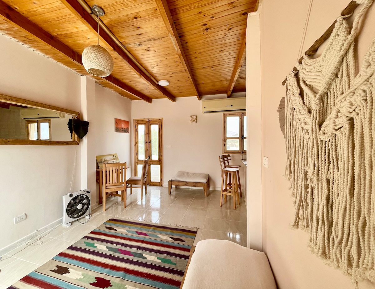 A bohemian-style studio in Dahab, sea view in Eel garden and just steps away from Coral Coast. It features one cozy bedrooms, an open and stylish reception area, and a lovely rooftop with stunning sea views. The interior is designed with a warm, bohemian vibe, reflecting a calm and relaxing atmosphere, with natural decor and earthy tones. It’s the perfect place to unwind and enjoy the beauty of the sea and nature