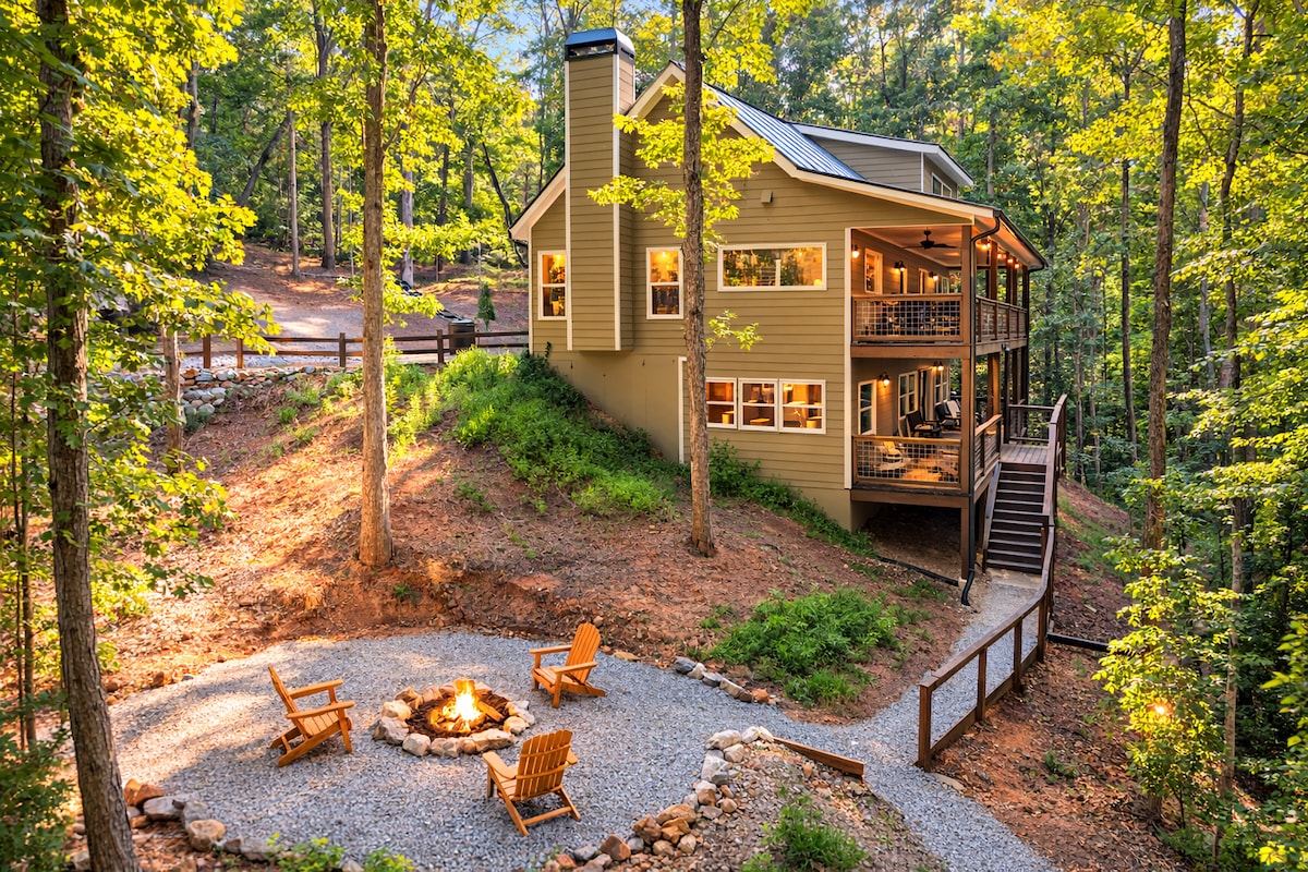 Dragonfly Treehouse: A Romantic Getaway in Dahlonega, GA Escape to the serene beauty of Dahlonega, GA, and experience the magic of The Dragonfly Treehouse—your perfect romantic retreat. Nestled among the trees, high above your own private pond. This luxurious hideaway offers everything you need for an unforgettable stay. Movie Theater, Hot Tub, Sauna, Nespresso, Soaking Tub, Luxury Shower, Heated Bathroom Floors, Towel Warmer, Put Green, Fire Pit, Outdoor Cabana Retreat w/TV and Floating Bed.