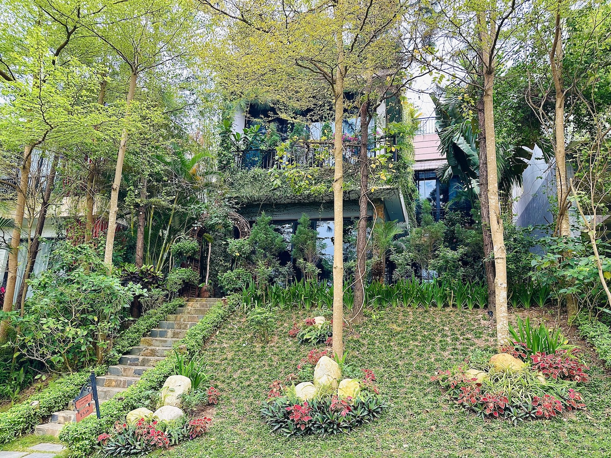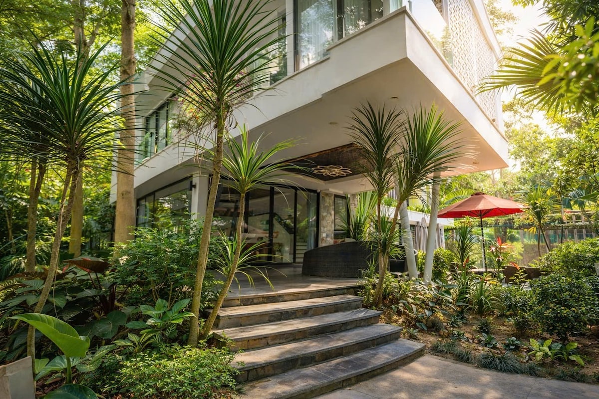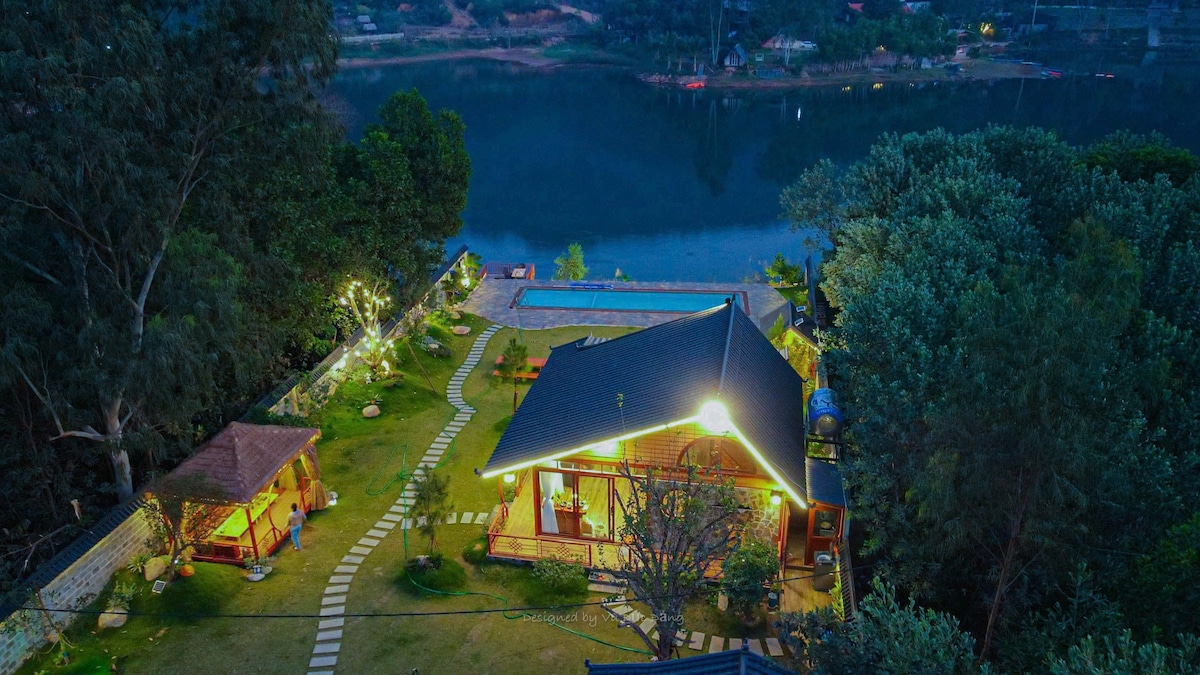 Rest and relax in the peaceful, poetic space of LIME House on the shore of Phu Nghia Lake, Soc Son, Hanoi. A duplex wooden house with large glass panels filled with light, hidden in a garden filled with chirping birds. In front of the house is a small wooden swimming pool, connected to a large porch, a dining table, a BBQ kitchen under a purple flower trellis. A long green lawn, next to a row of dark pine trees. 20 minutes from airport 60 minutes to Center Hanoi City.