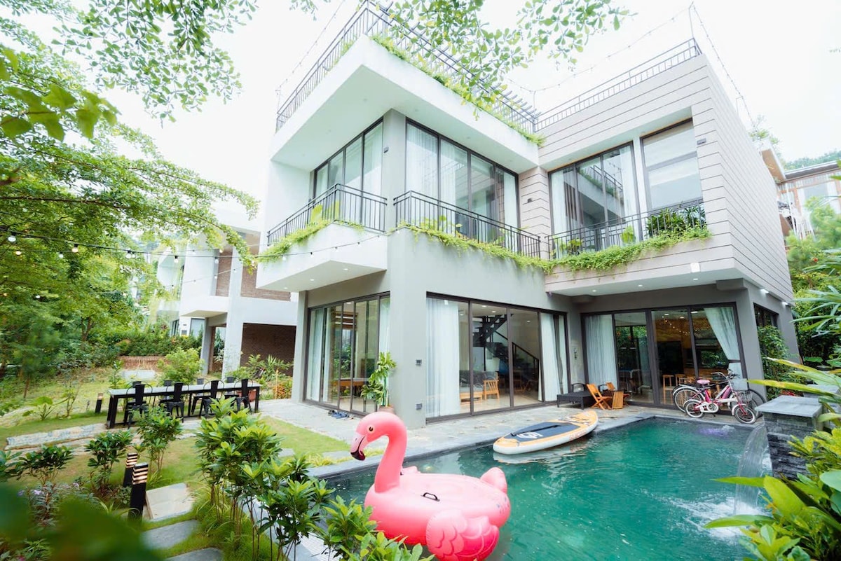The villa is located 35km from the center of Hanoi and only 13km from Noi Bai International Airport. (Pets allowed) 👉🏻 Free Pickleball, swimming pool 👉🏻 Assistance with booking shuttle service ☘️ There is a super chill cafe with mountain views near the villa 🌸 Surrounded by lush greenery and romantic pine hills, with a vast 10,000 m2 space. The air is incredibly fresh and clean. You will be delighted and satisfied with the space and the attentive, enthusiastic service.