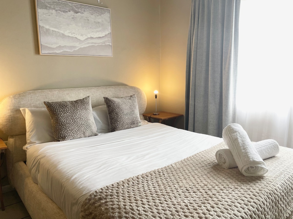 We welcome you to relax in our calm and luxurious space situated in a quiet section of Fourways. The apartment is uniquely and tastefully designed with amenities that radiate style and comfort. Treat yourself to this stunning apartment with a queen size bed, a fully equipped kitchen and a modern bathroom. Unwind on the patio or on the couch and enjoy a TV with Netflix and Youtube. The apartment has electricity backup that runs the TV and the Wi-Fi. Book your stay today and indulge in luxury.