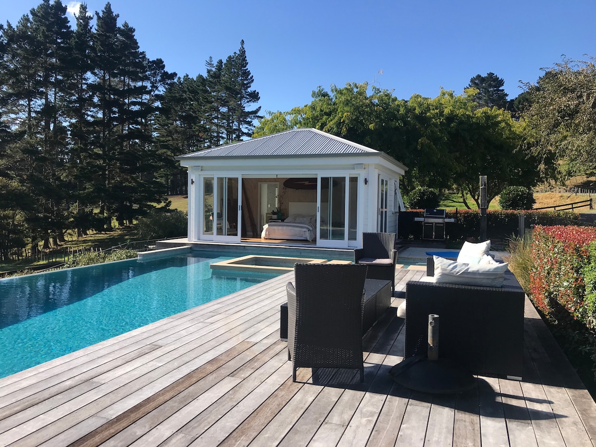 Don't be fooled by the name, the NZ Summer house is idyllic all year round. Set on an equestrian lifestyle property down a quiet country lane. Open your bedroom doors to the relaxing pool area or private outdoor courtyard off the bedroom and enjoy a cup of coffee with the sounds of nature. 30 minutes from the CBD and close to award-winning restaurants, vineyards and the west coast beaches. Bring your walking shoes or bikes, we are within walking distance to the Riverhead forest.