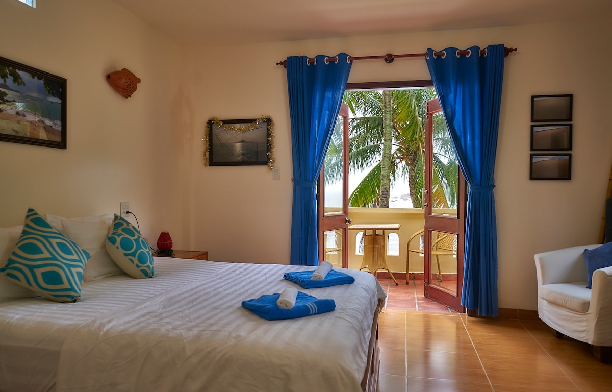 This is a light and airy private room with comfortable bed, large balcony and sea and garden views. Our guesthouse, Haven, sits at the sheltered end of a picturesque cove next to the fishing village of Bai Xep, just south of the up-and-coming port city of Quy Nhon, South Central Vietnam. Our five private rooms adjoin a quiet courtyard and a common lounge area with comfortable seating, small library and long table suitable for laptop work, writing, drawing or playing games with friends.