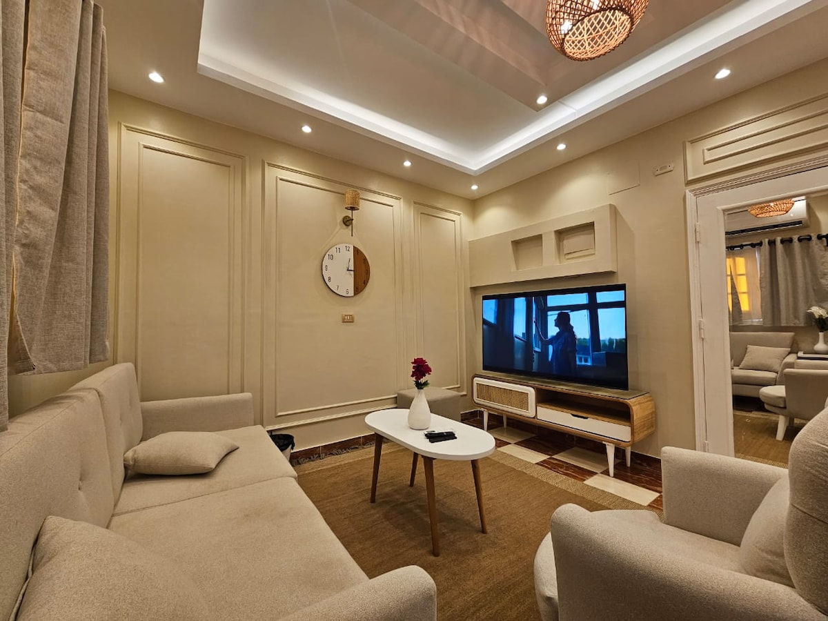 Charming design, view and location. The apartment provides all the pleasures and perks. A fully furnished private residence. Perfect for weekend getaways, business trips and work from home or cozy home base while exploring everything in ras el bar and damietta. Unbeatable location 5 mins walk to beach and pool with access to restaurant, cafe, mosque and market. 5 mins drive to nearby aquapark, circus and amusement park 10 mins drive to city center 20 mins to damietta 30 mins to New Damietta