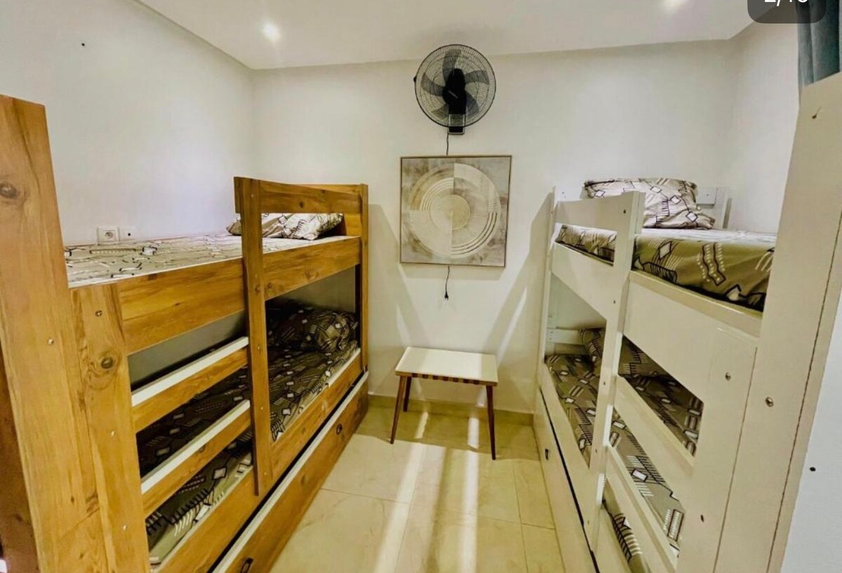 Ch JAUNE. Vue imprenable sur l'océan. 2 terrasses, déco mosaïques et coquillages, grande plage de sable fin, accès direct à la mer. A 30 km au sud de Dakar et à 200 m du village de pêcheurs, chambre avec salle de bain privative, eau chaude, rangements, moustiquaires aux fenêtres et lits, ventilateurs, 1 salon-salle à manger et une cuisine en commun. wifi gratuit Gardien 7J/7, femme de ménage, possibilité de commander repas et petit déjeuner. 2 autres ch sont à louer (voir Airbnb ch 2 et 3)