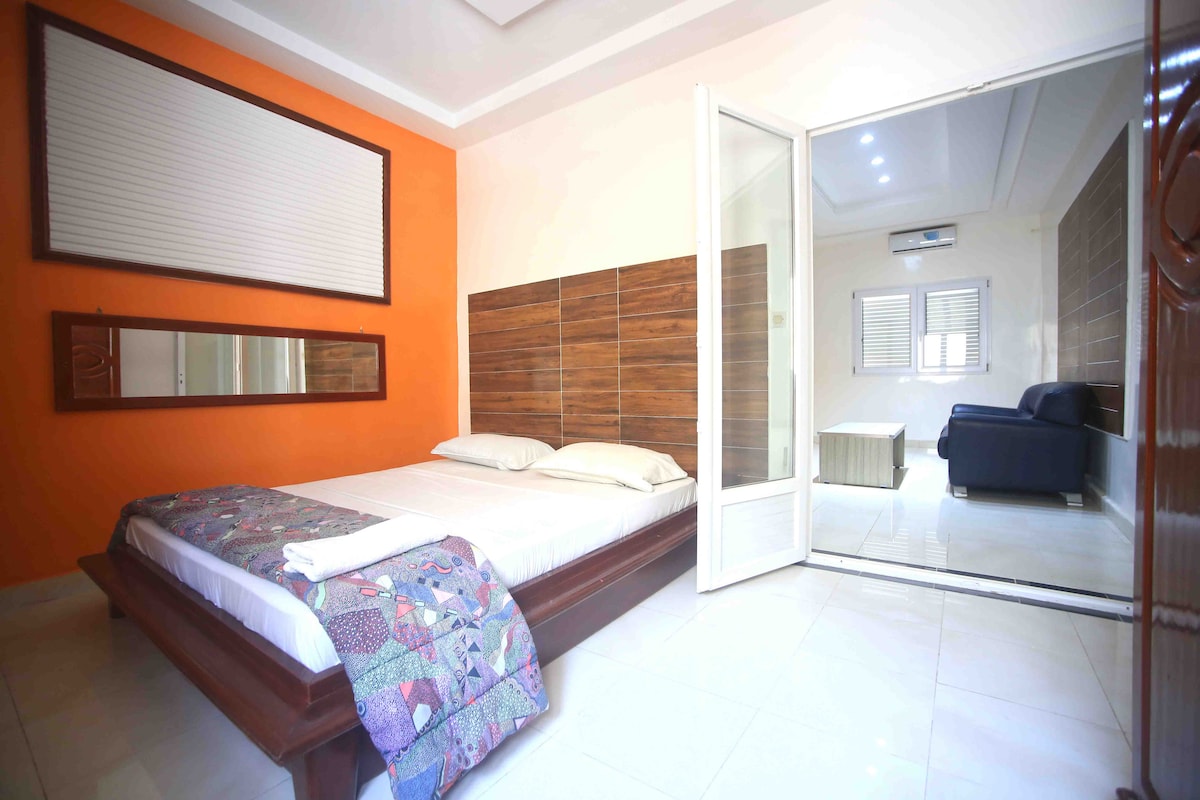 une magnifique chambre dans un appartement spacieux composé de 3 chambres, dont l'une est proposée en location également. dotée d'un dressing et d'une salle de bain privée, cette chambre représente ce dont vous avez besoin afin de passer un excellent séjour à Dakar. vous aurez accès à un immense salon avec une smart télé, une énorme table à manger, et une cuisine toute équipée. Une somme de 2500f par nuitée sera facturée en plus comme frais d’électricité.