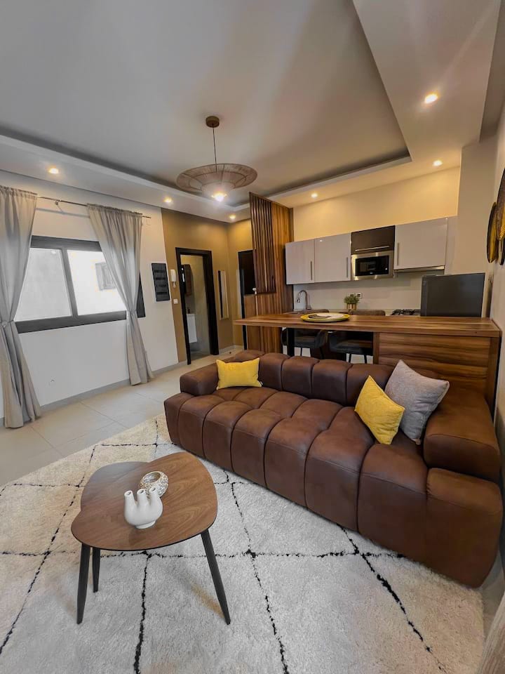 Séjournez dans un appartement moderne et elegant situé au coeur des Almadies, juste en face de l’Hôtel BOMA. Idéal pour les voyageurs en quête de confort et de tranquillité, cet appartement propose une Wi-Fi haut débit, une Smart TV et une cuisine entièrement équipée. L’immeuble offre une sécurité 24h/7, une salle de sport, un grand salon commun, un ascenseur ainsi qu'un parking gratuit. Profitez également de nos services exclusifs : Transfert à l'aéroport & Location de voiture.