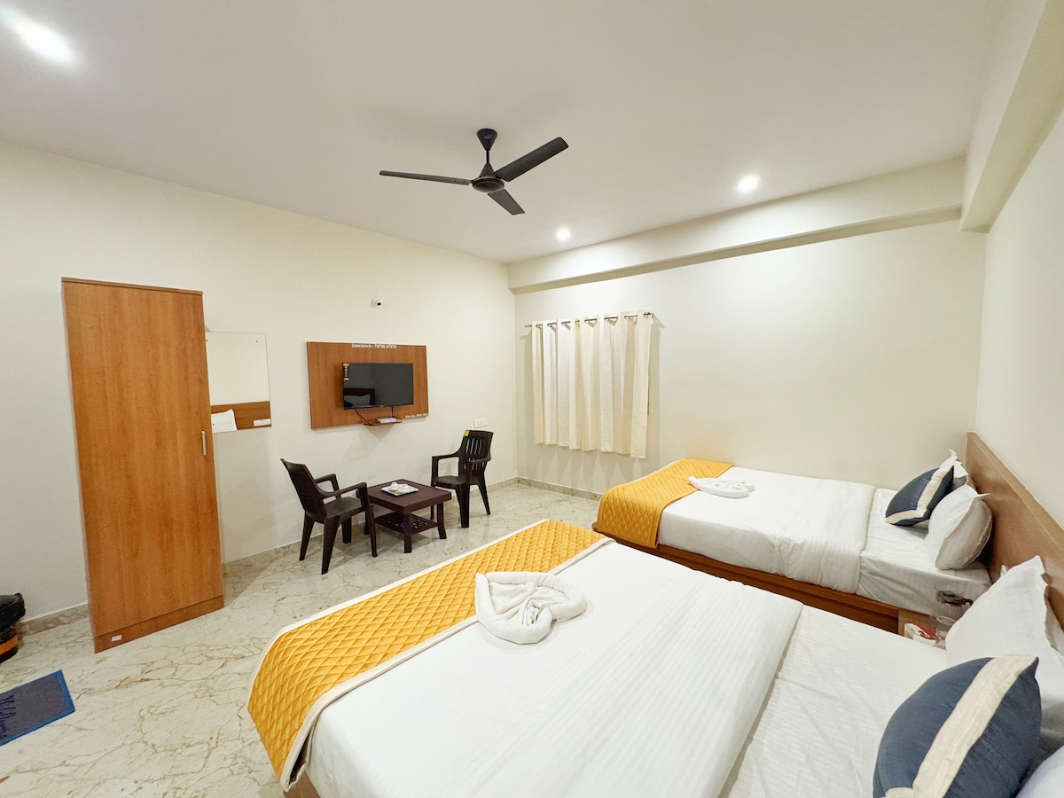 The hotel is located in the scenic town of Dharmasthala, just a stone's throw away from the famous Sri Manjunatha Temple. The hotel offers comfortable accommodations, with a variety of room options to choose from, including standard rooms and deluxe rooms. Guests can enjoy a range of modern amenities, including free Wi-Fi, flat-screen TVs, and air conditioning. This hotel offers a great location, for those looking to visit the famous Sri Manjunatha Temple and explore the town of Dharmasthala.