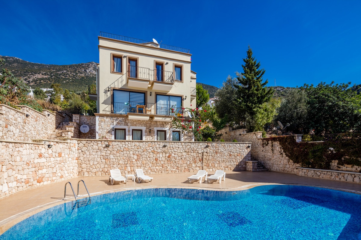 This stunning 4 bed/4 bath villa with a heated pool* & jacuzzi* offers breathtaking views from every corner and is only 5 minutes walking distance from the beach . Recognized with 2024 top design award by the Turkish Architecture Board, features generously sized pool, panoramic windows, luxury marble bathrooms, sauna, gym and several terraces. Located in a Kisla, a high-in-demand upscale area in Kalkan, provides a peaceful & relaxing environment. *small surcharge for heating upon request
