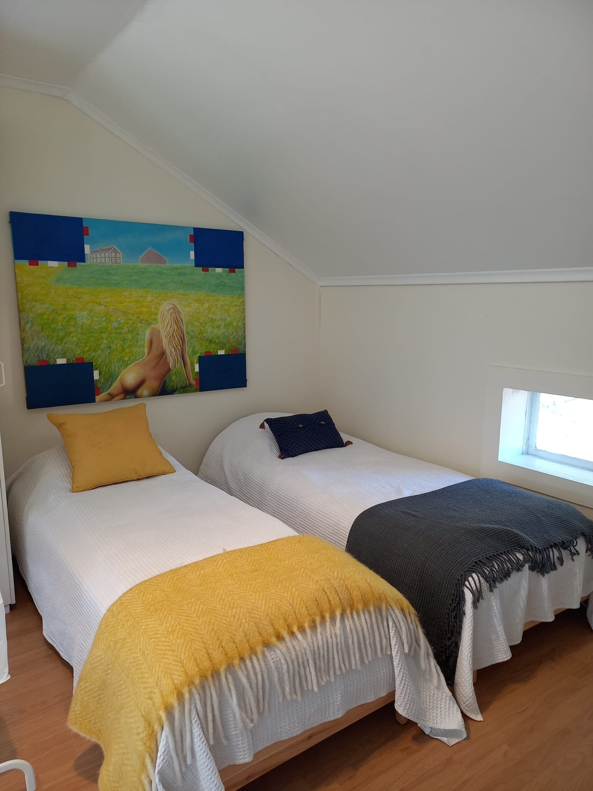 I en lite by i Dalarna har vi renoverat ett litet hus på gården. Nära till natur, fiske och golf. Två fasta 90cm sängar som sitter ihop till en dubbelsäng om man vill , en stor soffa samt arbetsyta på övervåningen. En fåtölj som man kan fälla ut till en säng, fungerar bäst för ett barn eller ungdom. Bottenvåningen består av nyrenoverat kök, matbord, toalett med dusch samt en bäddsoffa för två. Möjlighet till gästsäng finns för ytterligare en person.