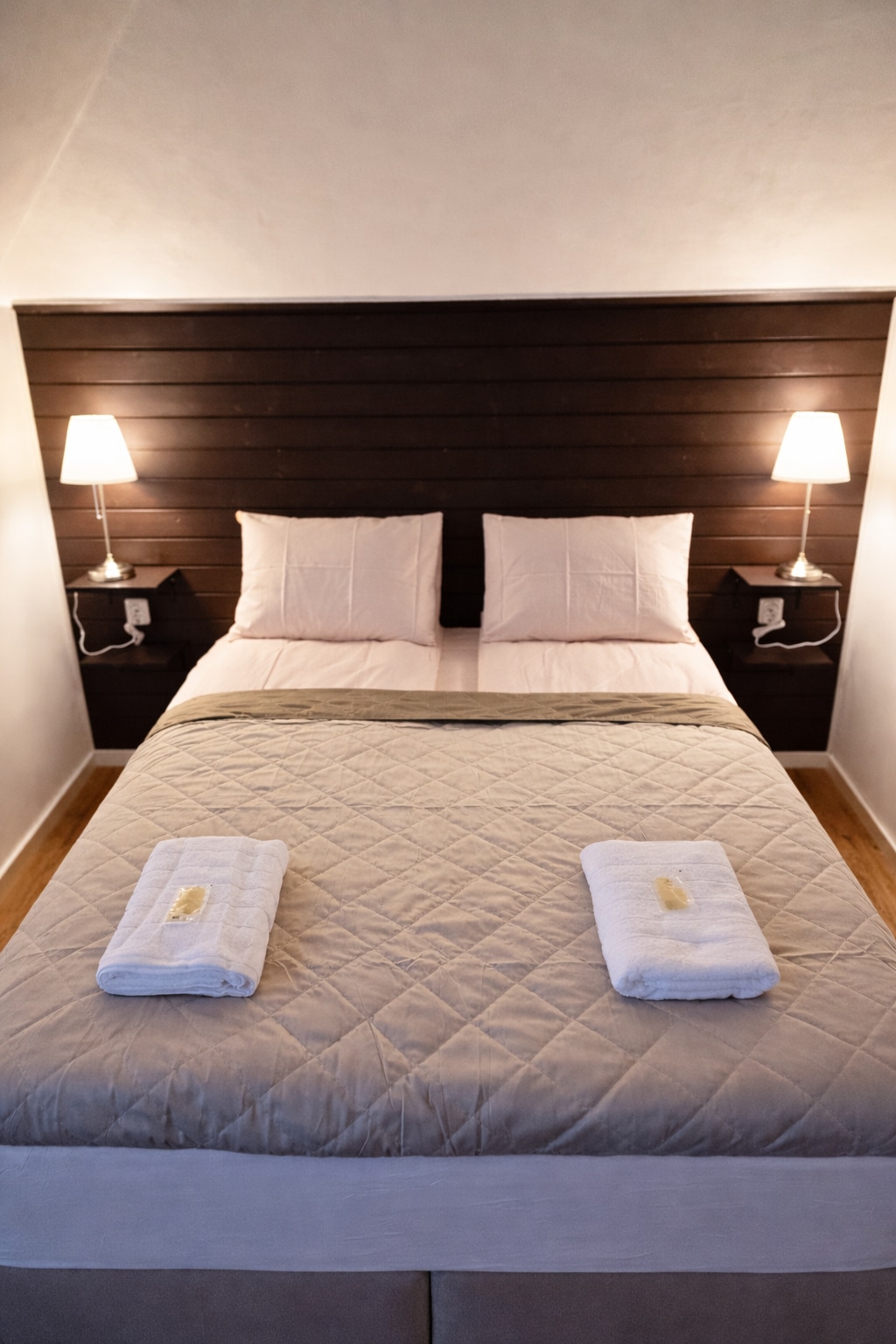 A cozy family room of about 20 m² with exposed wooden beams and a practical layout. The room features a double bed and a bunk bed, as well as a surprisingly spacious bathroom with underfloor heating. Both the room and bathroom have been recently renovated in a modern style. A crib can be provided if needed, though it makes the room a bit tight. Best suited for 2 adults and up to 2 children (maximum age 13).