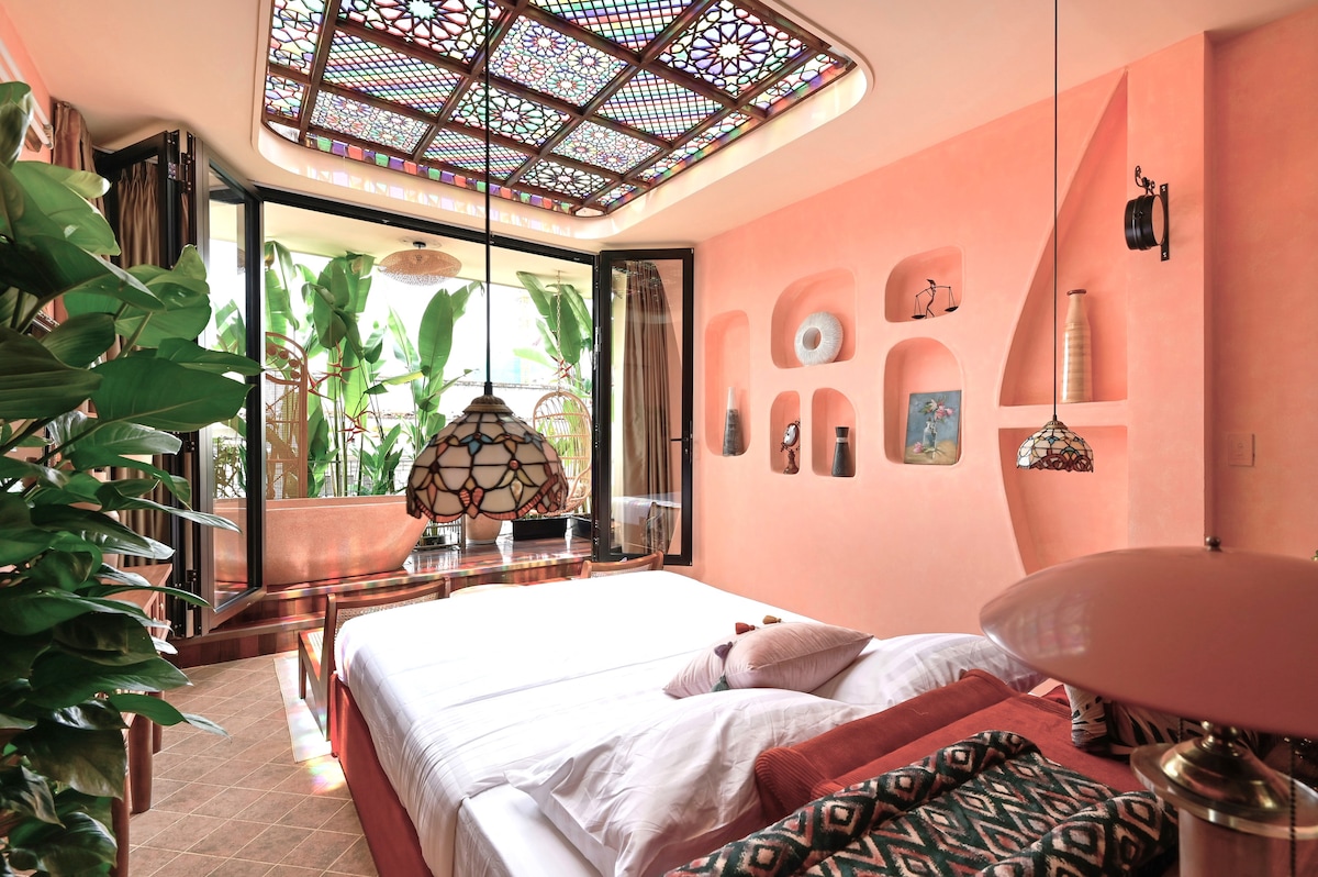 As you step inside this stunning house , you'll be greeted by a spacious and airy living area with ample natural light streaming in through a large special stained glass skylight in the heart of the living room. The open concept floor plan seamlessly flows from the beautiful open- space bathtub through bed-living room into a spacious kitchen with floor-to-ceiling glass doors that open onto the garden. This place is just an luxurious greenery oasis and perfect choice for travelers to unwind