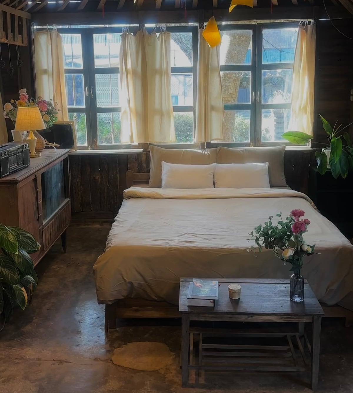 🏡MORE Home – Không gian nhà gỗ theo phong cách Rustic (mộc mạc). MORE là căn nhà mang phong cách mộc mạc với không gian nhiều cây xanh xanh tạo cảm giác thư giãn và dễ chịu khi bước vào. Từ những chậu cây nhỏ được trang trí trong nhà đến khoảng sân trước thoáng mát. Tất cả mang lại một vibe rất chill và gần gủi với thiên nhiên, phù hợp cho cả cặp đôi muốn tìm nơi riêng tư lãng mạn, gia đình nhỏ cần không gian nghỉ ngơi thoải mái lẫn nhóm bạn cần không gian thư giãn.