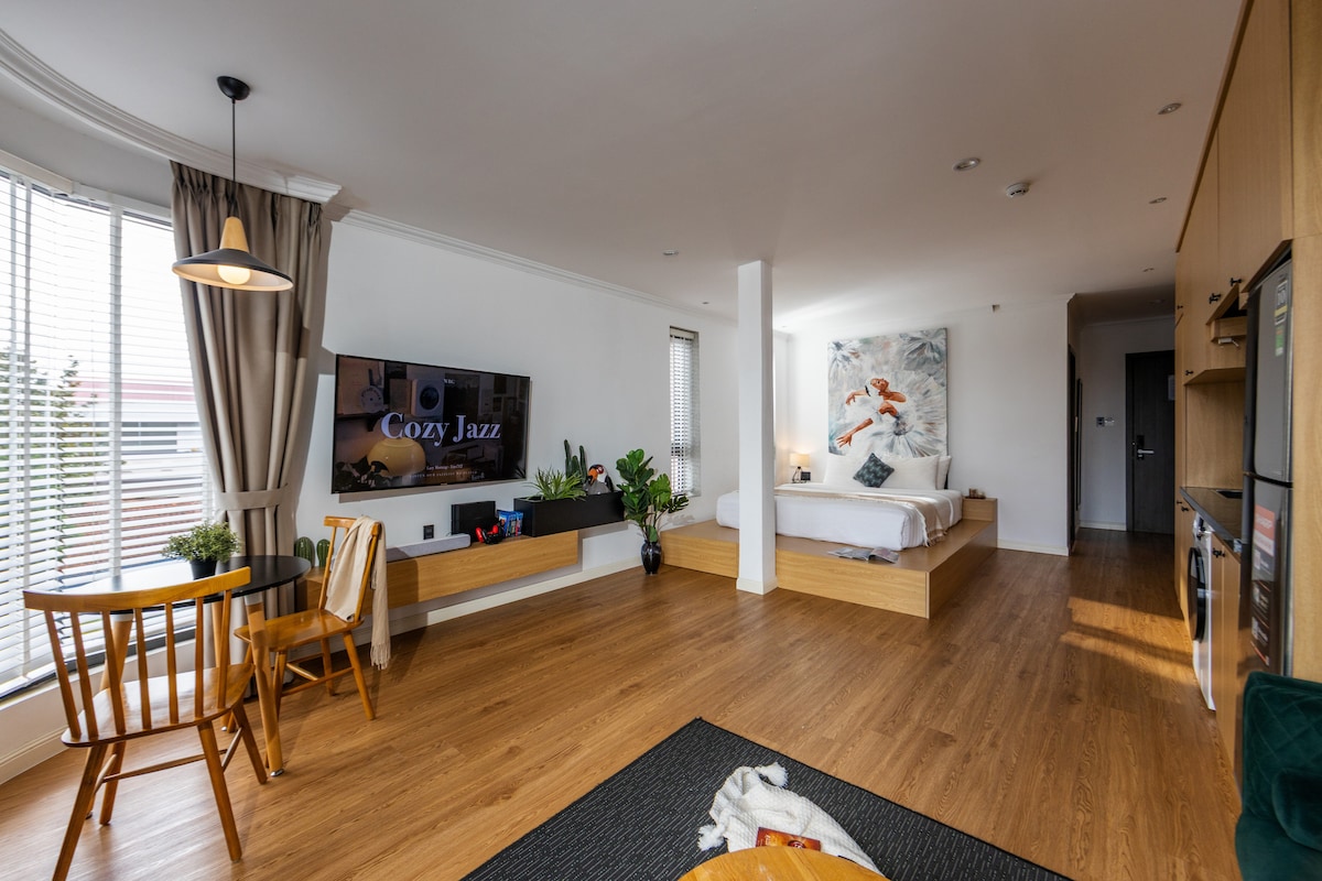 ✻ A studio apartment (30m2) features a king bed (1.8m) ✻ Located in a safe and quite residence, suitable for light sleeper ✻ 1.5km to city center and plenty of famous landmarks, food and drink nearby ✻ Fully equipped kitchenette, washing machine, iron, hair dryer, etc ✻ Smart TV 40 inch. Fast wifi internet. Laptop friendly work space ✻ Free car parking on premise ✻ 24/7 front desk support. Motorbike & car for rent, airport shuttle