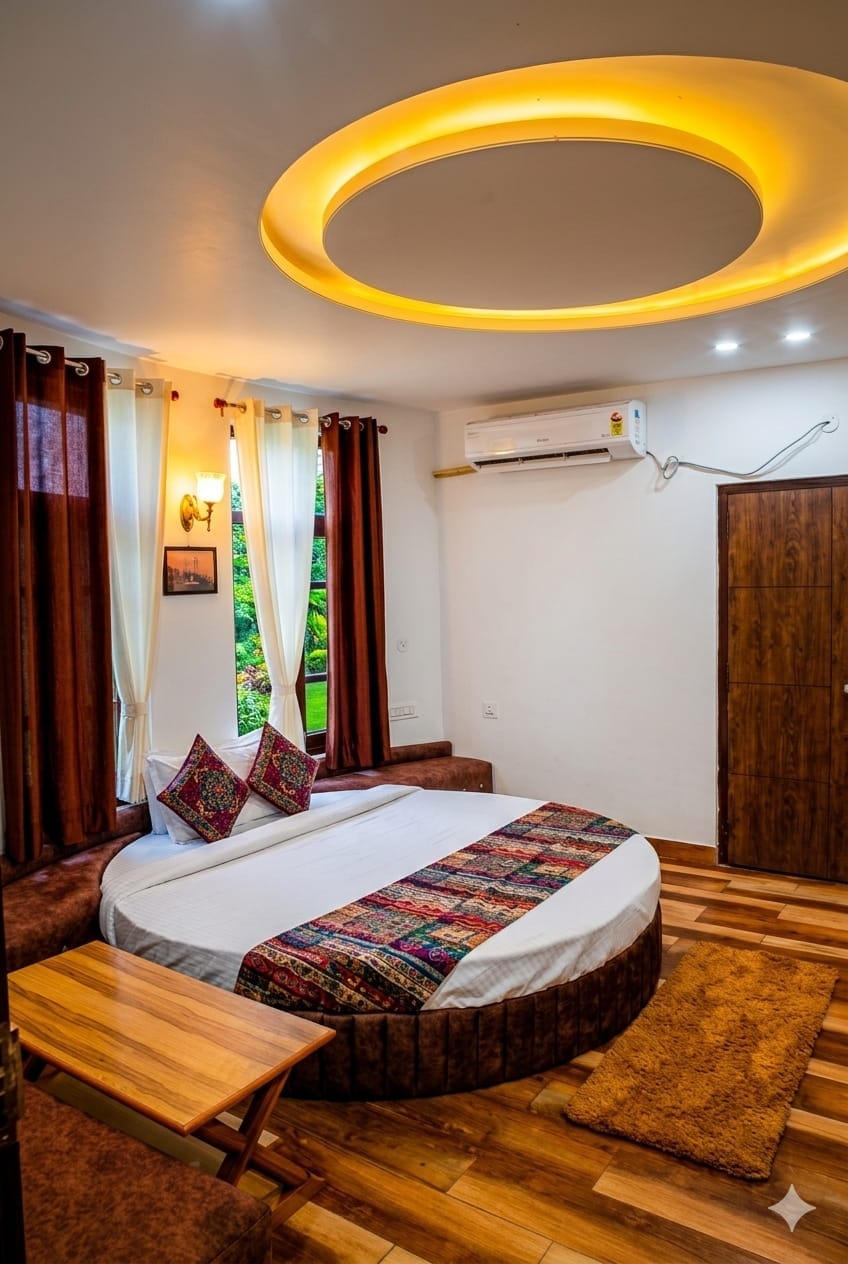 Let natural light flood in through the sunroof, casting golden hues across this dreamy Attic Suite at Indulge McLeodganj. With postcard-worthy valley views, ambient interiors, and cozy nooks for reading or lounging, this space feels straight out of a mountain novel. Ideal for creatives, dreamers, and couples chasing beauty.